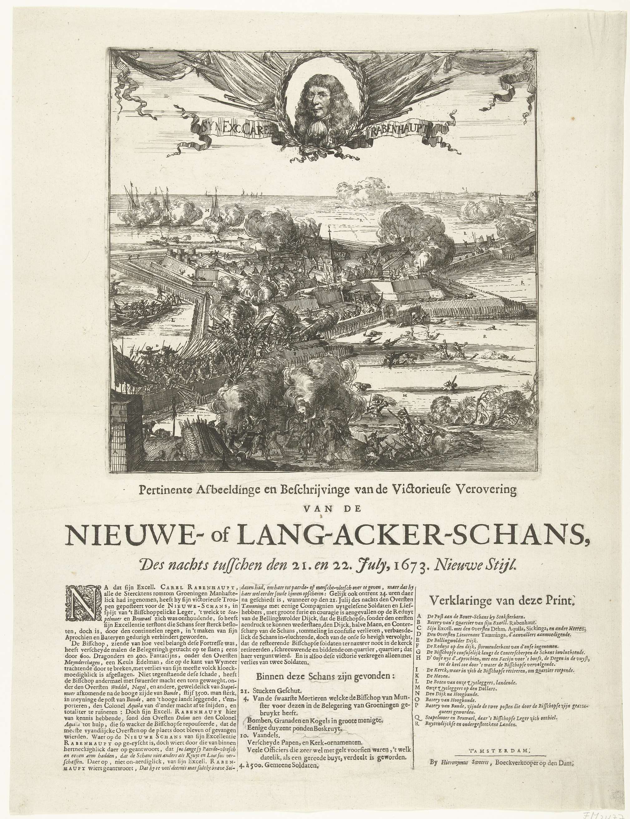 Verovering van Nieuweschans door de Staatse troepen onder Rabenhaupt op het Bisschoppelijke leger in de nacht van 21 op 22 juli 1673. De bestorming van de schans, bovenaan een portret van Rabenhaupt. Onder de voorstelling een beschrijving van de gebeurtenissen en de legenda A-R in 3 kolommen in het Nederlands.