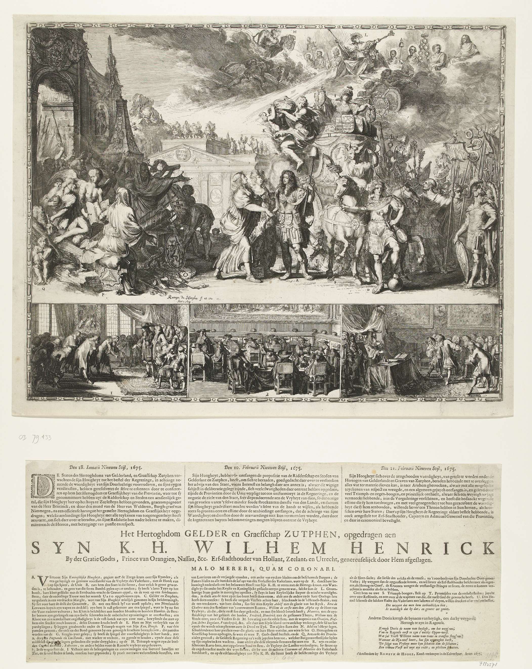 Allegorie op het aanbieden van het hertogdom Gelre en het graafschap Zutphen aan Willem III in januari 1675 die deze op 21 februari afslaat. Provinciemaagden van Gelre en Zutphen staande bij Willem III. Achter hen de strijdwagen en leger van stadhouder Willem III met Victorie in de wagen. Links de burgerij, Armoede en Godsdienst zittend ...