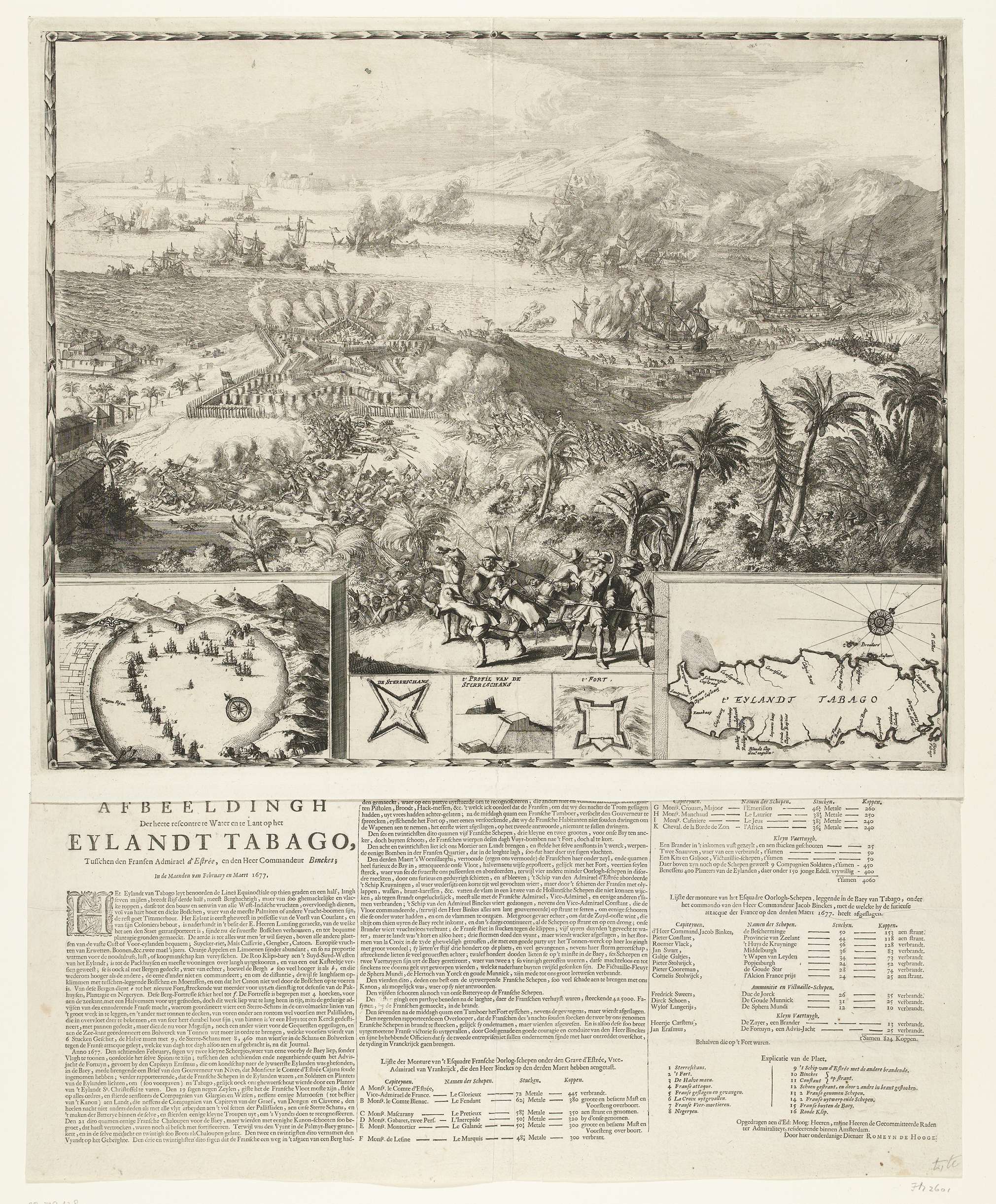 Gezicht op het eiland Tobago met de gevechten tussen de Hollanders en Fransen op het land bij de Sterreschans en tussen de schepen in de baai voor de kust op 3 maart 1677. Onderaan kleine voorstellingen met een gezicht op de baai, enkele plattegrondjes van forten en een kaartje van het gehele eiland. Bij de ...