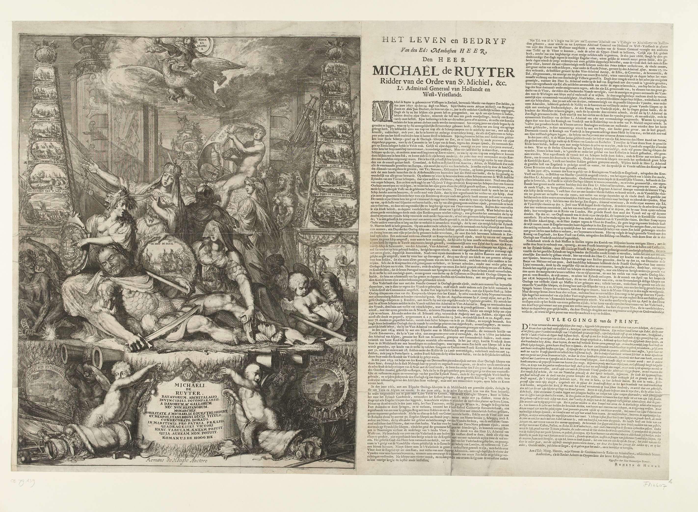 Allegorie op de dood van Michiel Adriaenszoon de Ruyter, 29 april 1676. Mausoleum met het lichaam van de overleden luitenant-admiraal-generaal beweend door de Nederlandse Maagd, de Amsterdamse stedenmaagd en een vrouw met zijn familiewapen. Hierachter Mercurius, Fortuin, Kracht en andere allegorische figuren. Aan weerszijden twee zuilen met afbeeldingen van de overwinningen van De Ruyter. Onderaan ...
