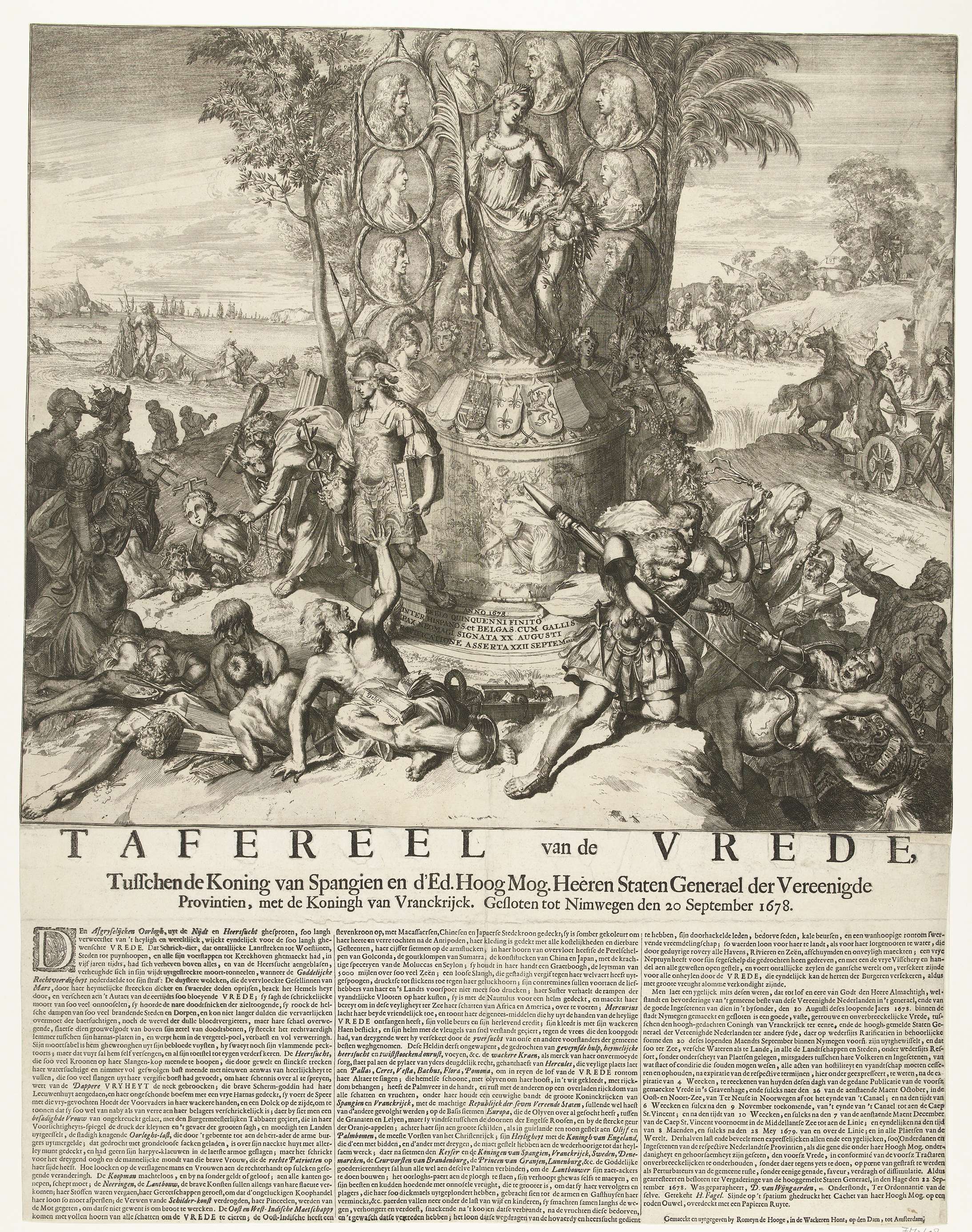 Allegorie op ratificatie van de Vrede van Nijmegen op 20 september 1678. Centraal een zuil met Vrede, de wapens van Spanje, Frankrijk en de Republiek, en de portretten in medaillons van acht vorsten. Rechts op de voorgrond verjagen de Hollandse Maagd, Rechtvaardigheid en Voorzichtigheid Oorlog en Nijd en Geldzucht. Links verdrijft Kracht Geveinsdheid, op de ...
