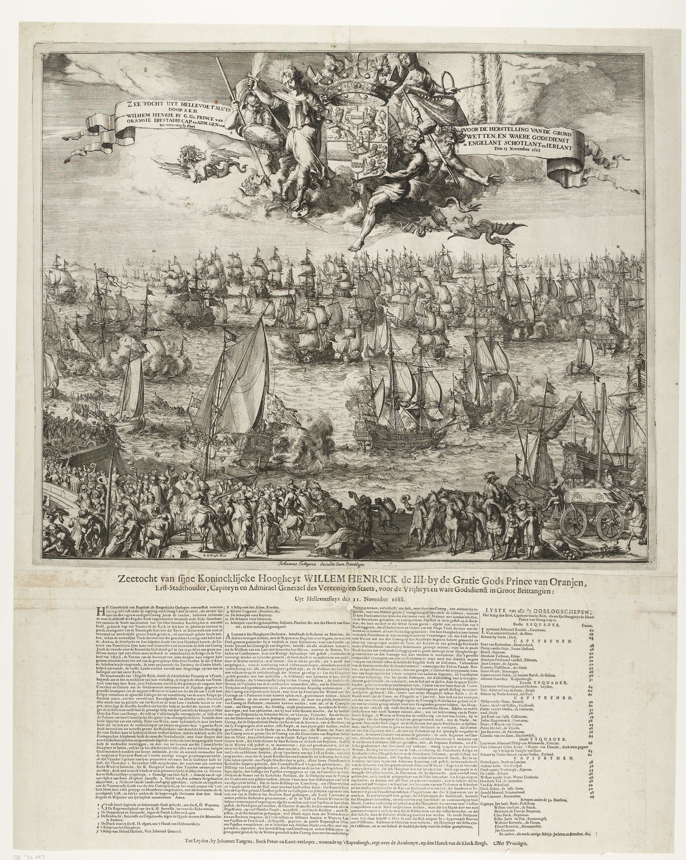 Vlootschouw bij het vertrek van Willem III vanuit Hellevoetsluis naar Engeland, 11 november 1688. Een menigte mensen op de kade zwaait de prins uit die in een pink naar het schip zeilt dat hem naar Engeland zal brengen. Bovenaan het wapen van de prins omgeven door allerlei allegorische figuren. Vastgeplakt onder de prent een tekstblad ...