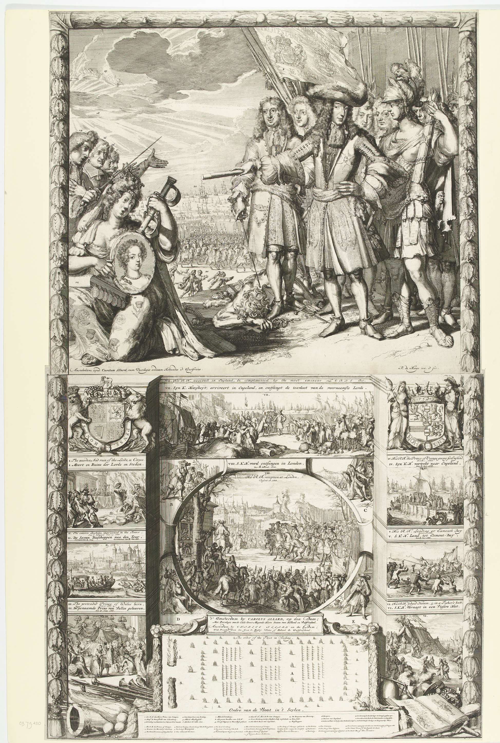Allegorie op twee platen ter ere van Willem III bij zijn komst naar Engeland, 1688. Op de bovenste plaat Willem III met zijn gevolg staande tussen Eendracht en de hertog van Schomberg. Achter de prins staan Bentinck en Torrington. Tegenover hem knielt Brittania met juk en het portret van Maria Stuart. Op de onderste plaat ...