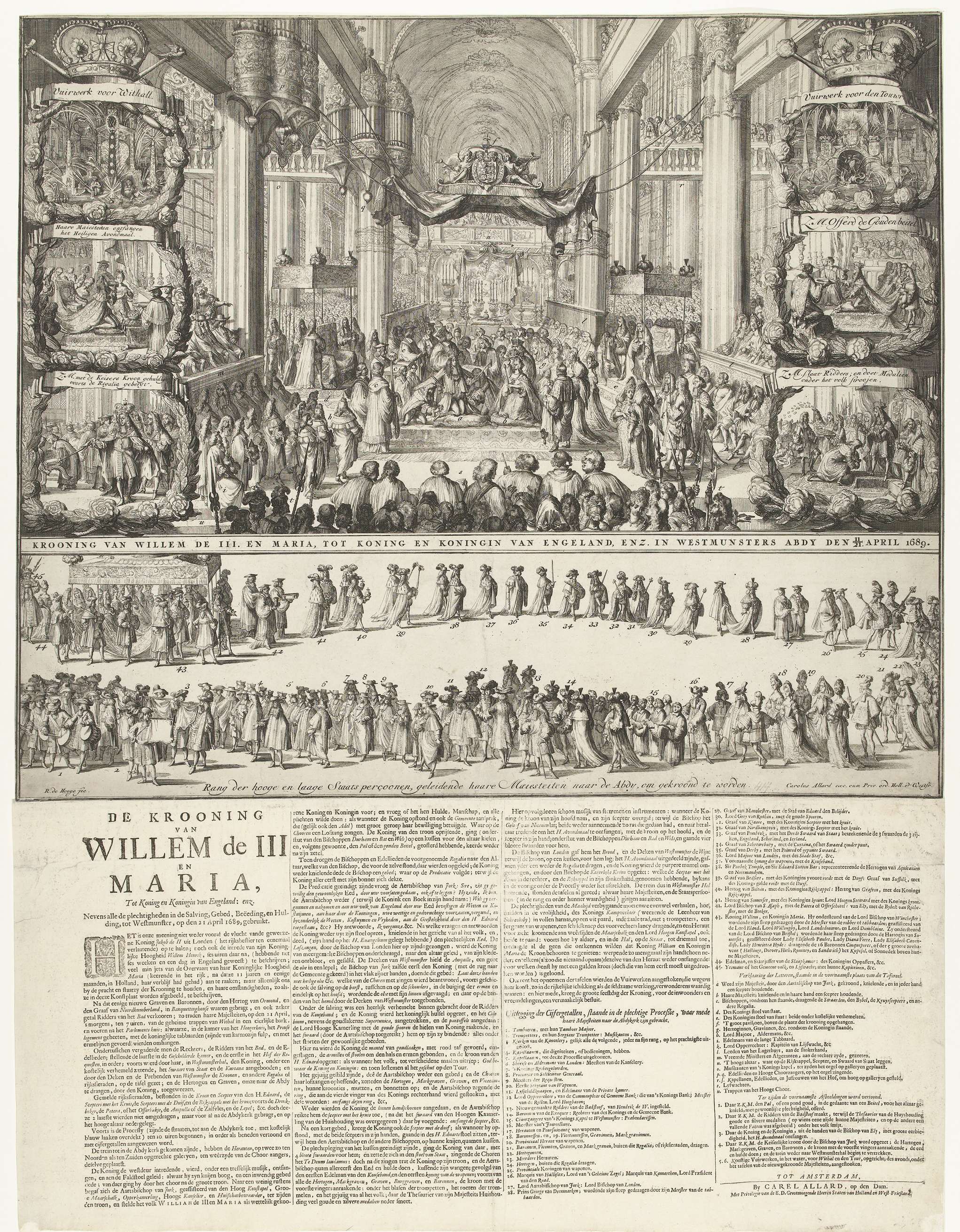 Kroning van Willem en Maria tot koning en koningin van Engeland in de Westminster Abbey, 21 april 1689. Uitvoerige voorstelling van de kroningsceremonie in de kerk met aan weerszijden drie kleine scènes van belangrijke momenten uit de plechtigheid. Hieronder een aparte voorstelling van de processie. Vastgeplakt onder de prent een tekstblad met een beschrijving van ...