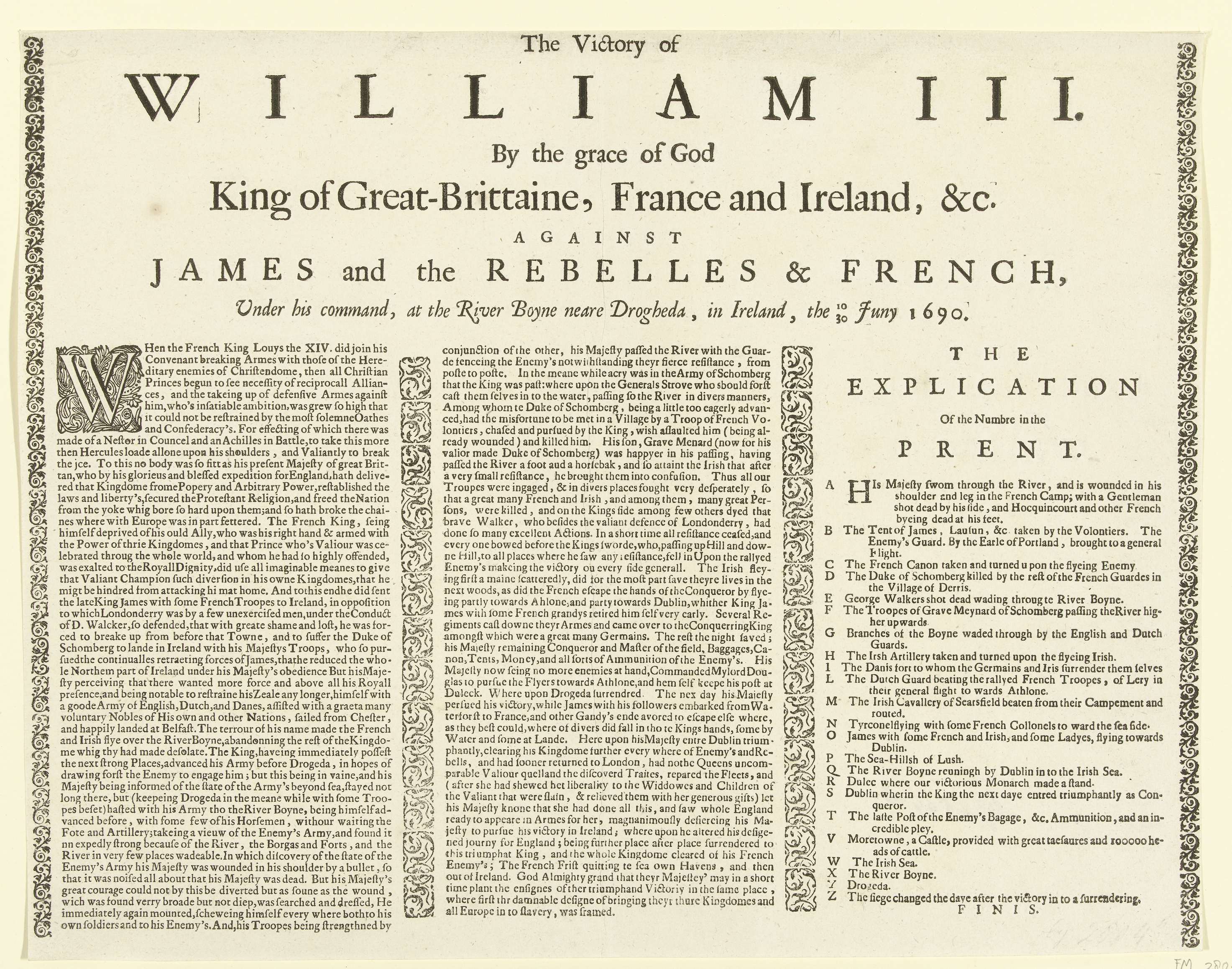 Overwinning van Willem III aan de Boyne, 1690. Latere druk met de twee oorspronkelijke platen versneden tot vier platen en met twee tekstbladen. Tekstblad met een beschrijving van het verloop van de slag en de legenda A-Z, in 3 kolommen in het Engels.