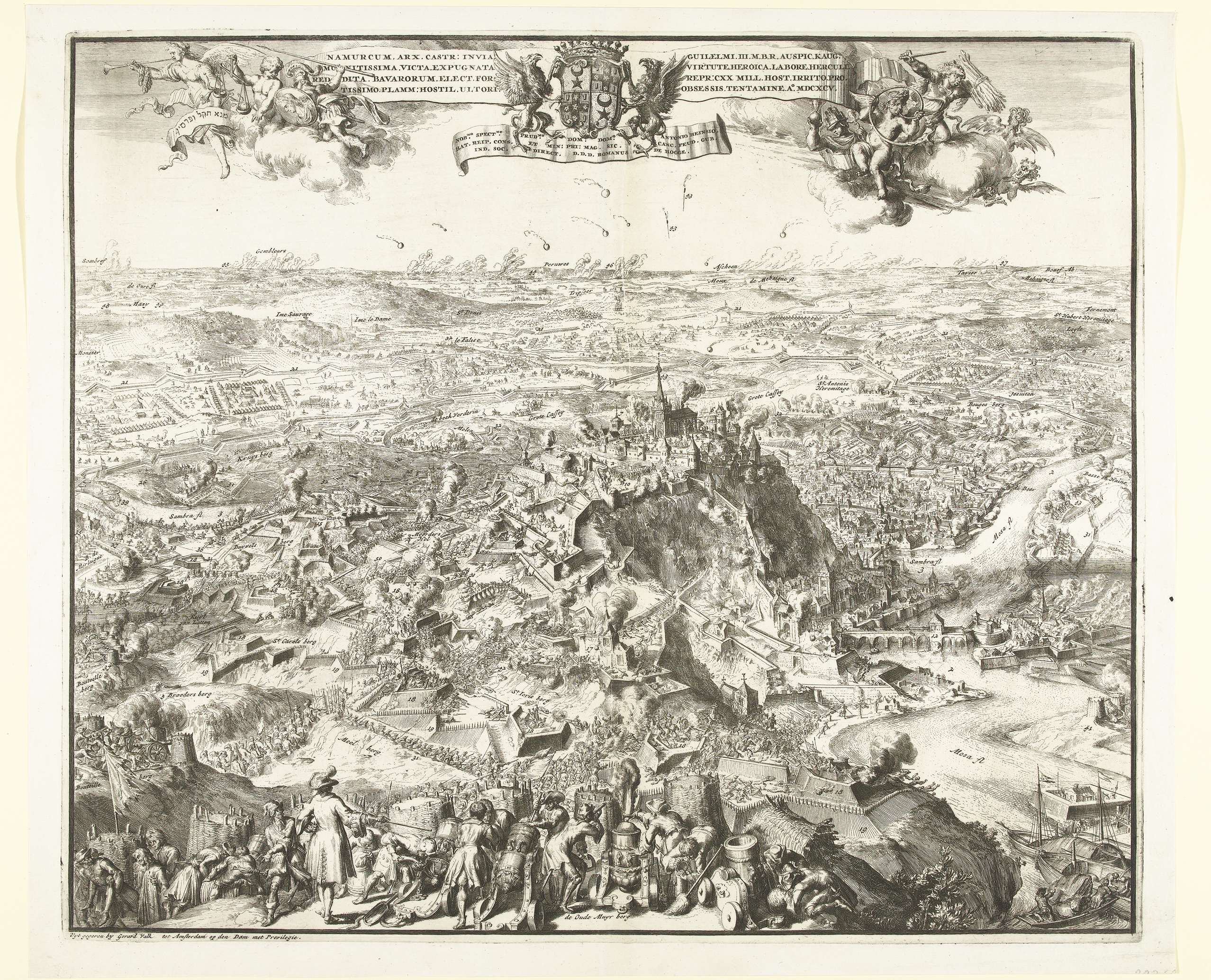 De beschieting van Namen en de citadel in 1695. Grote prent met een gezicht op de stad en de wijde omgeving vanuit de heuvels. In de lucht verschillende allegorische figuren rond het wapen van Anthonie Heinsius aan wie de prent is opgedragen. Bij dit exemplaar ontbreekt de tekst met de beschrijving van de strijd getiteld ...