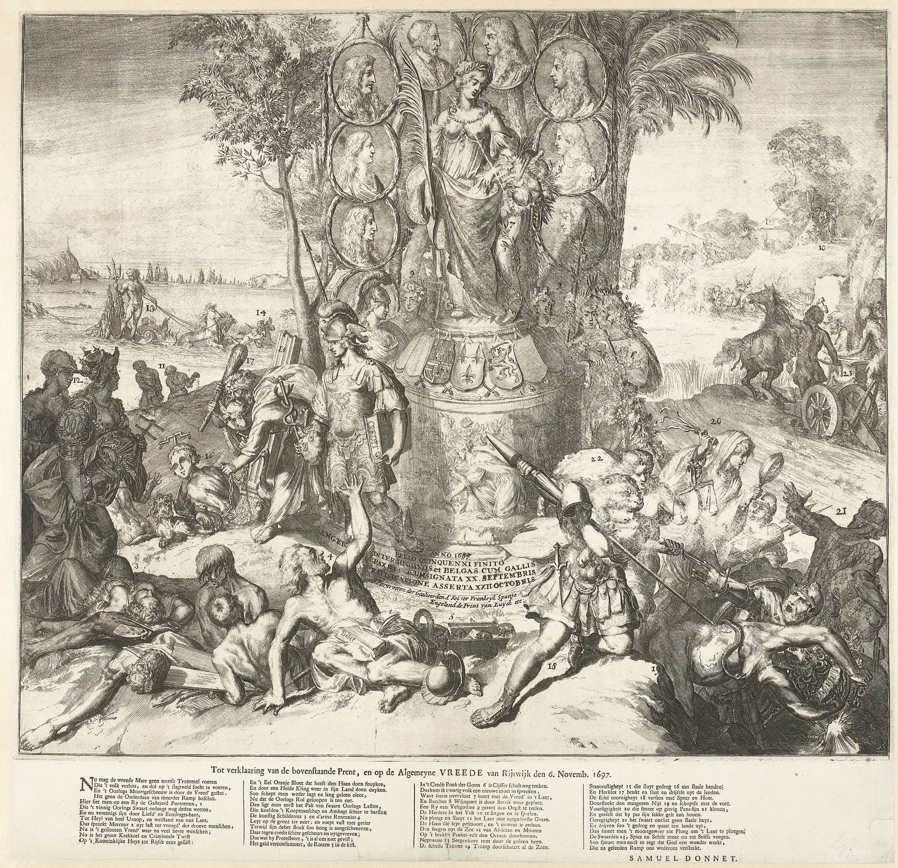 Allegorie op ratificatie van de Vrede van Nijmegen op 20 september 1678. Centraal een zuil met Vrede, de wapens van Spanje, Frankrijk en de Republiek, en de portretten in medaillons van acht vorsten. Rechts op de voorgrond verjagen de Hollandse Maagd, Rechtvaardigheid en Voorzichtigheid Oorlog en Nijd en Geldzucht. Links verdrijft Kracht Geveinsdheid, op de ...