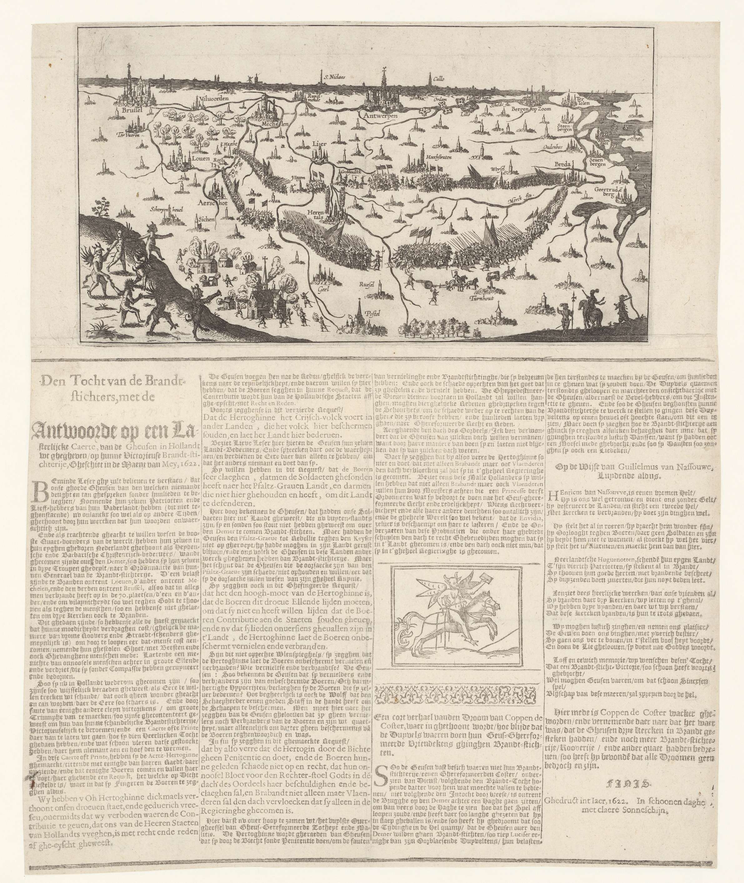 Antwoord op de prent met de veldtocht van Frederik Hendrik brandschattend door Brabant, 13-20 mei 1622. Gezicht over Brabant in vogelvlucht met steden en de Staatse troepen onder Frederik Hendrik die door het land trekken en brand stichten. Links op de voorgrond een groepje blij dansende duiveltjes. Onder de plaat een tekst in 4 kolommen ...