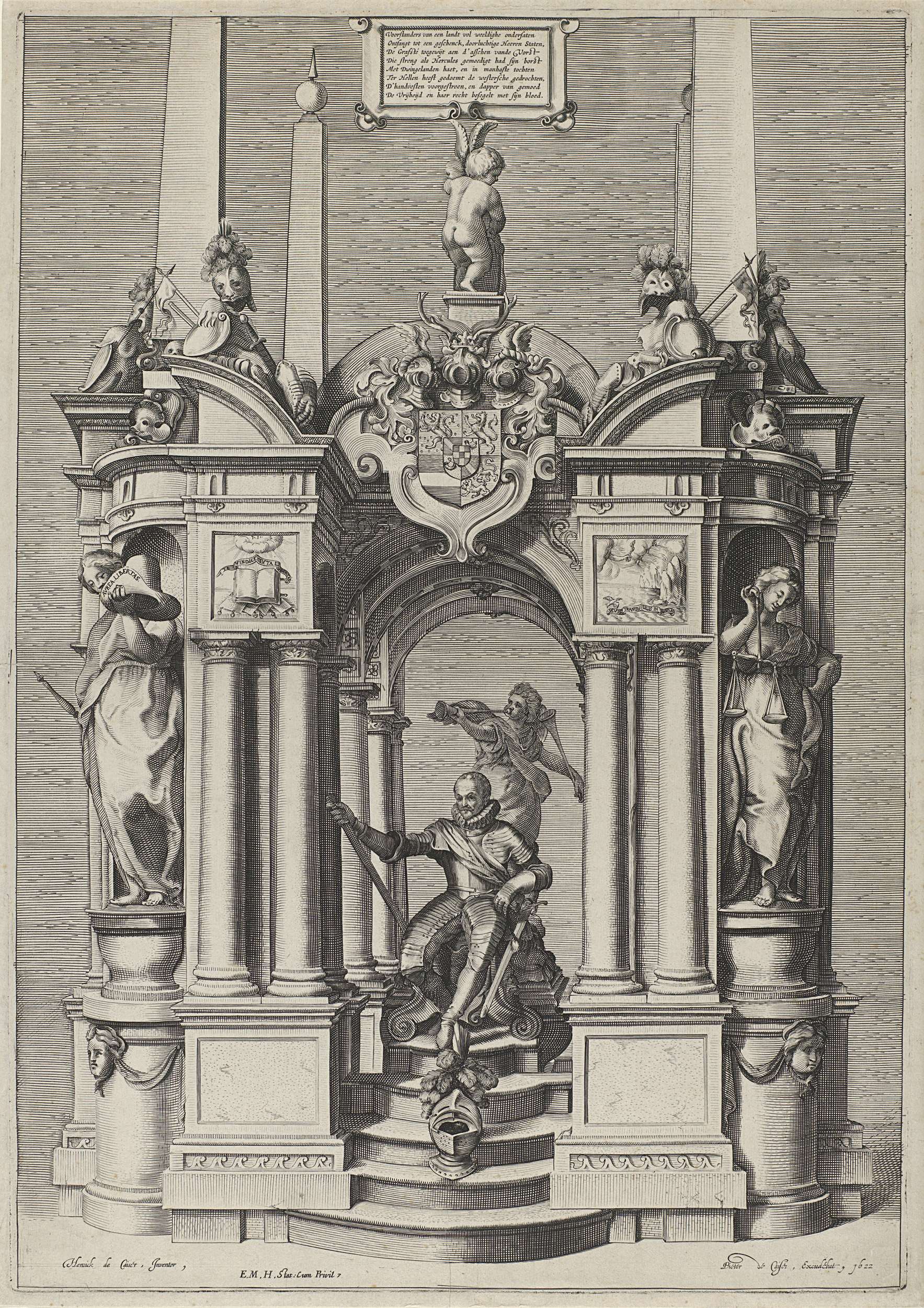 Graftombe of praalgraf van Willem I door Hendrik de Keyser in de Nieuwe Kerk te Delft, voltooid in 1623. Gezien van voren met het beeld van de zittende prins. Bovenaan een cartouche met tekst van 8 regels in het Nederlands.