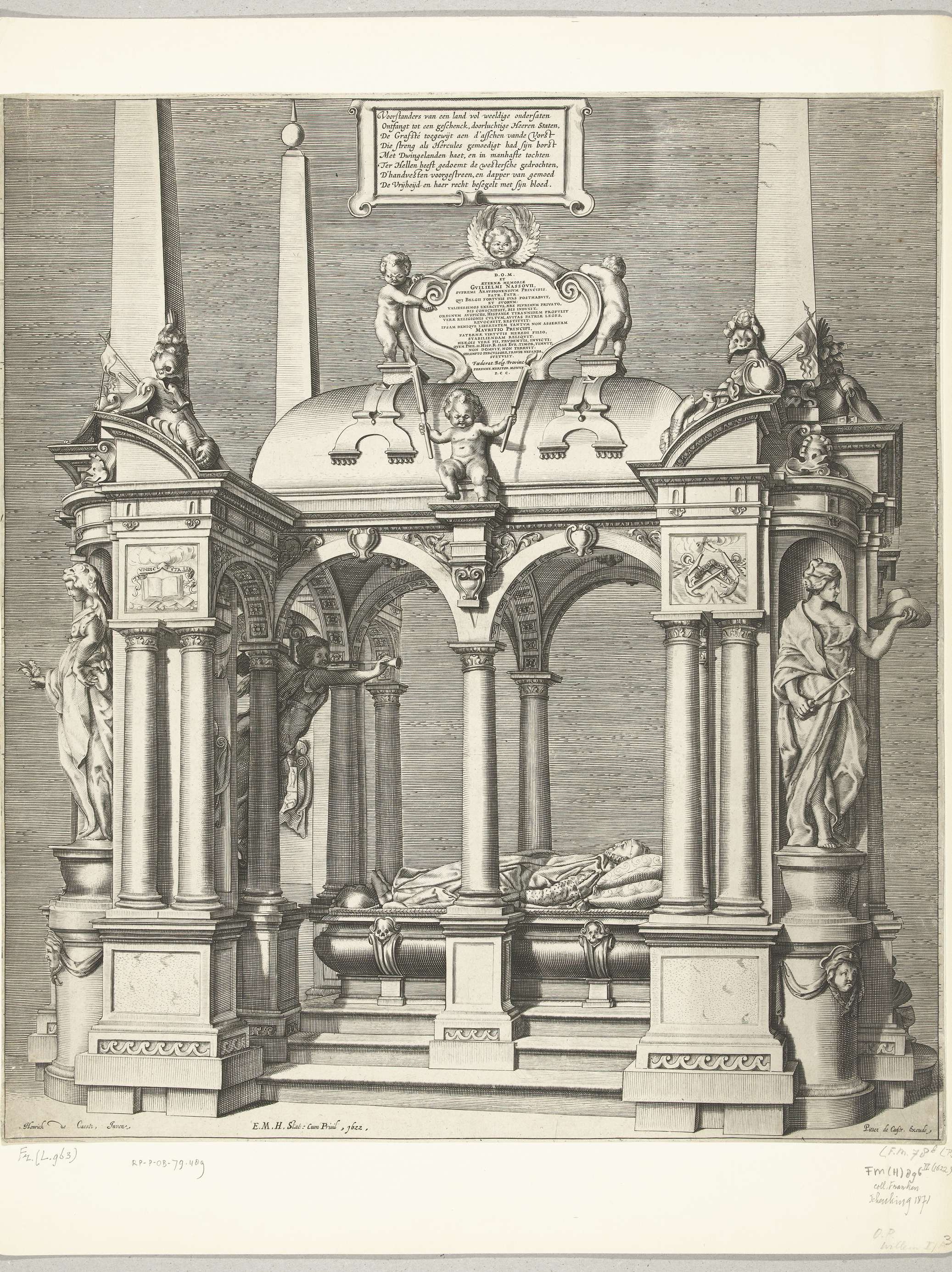 Graftombe of praalgraf van Willem I door Hendrik de Keyser in de Nieuwe Kerk te Delft, voltooid in 1623. Gezien van de zijkant met het beeld van de liggende prins. Bovenaan een cartouche met tekst van 8 regels in het Nederlands.