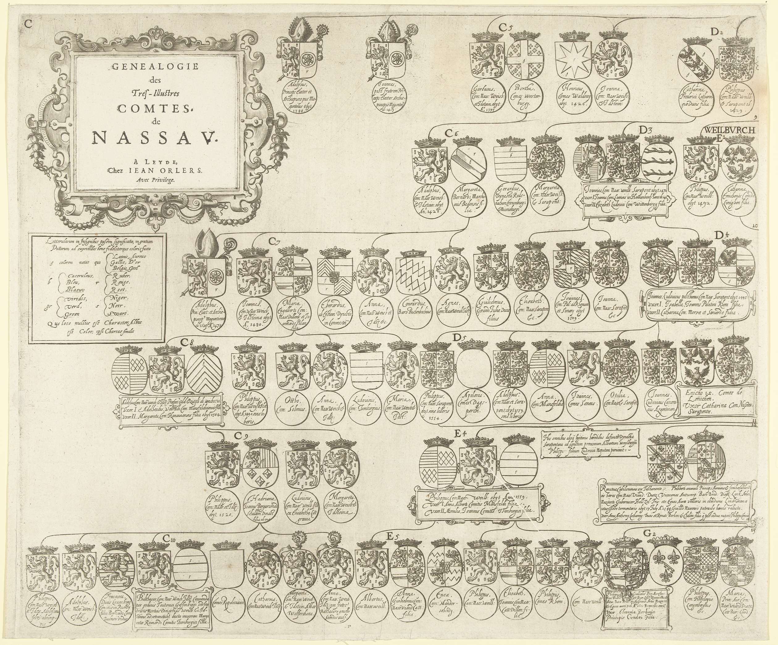 Stamboom van het Huis Nassau, van 972 tot en met 1612, blad C in een reeks van zeven bladen gemerkt A-G. Meerdere wapens met in cirkels en cartouches namen, titels en jaartallen. Linksboven in een geornamenteerde rechthoek zes regels Latijnse tekst.