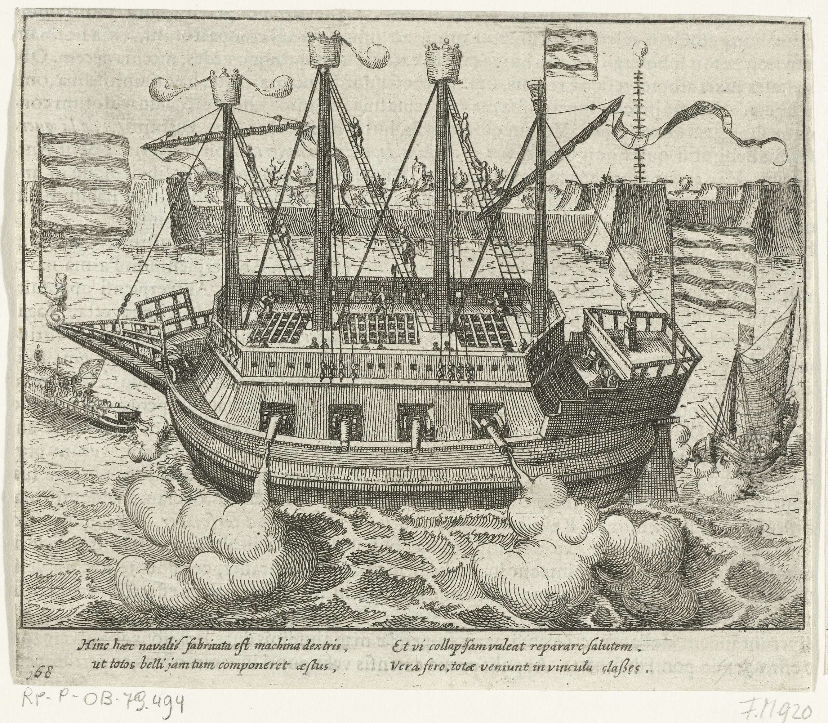 Het enorme schip genaamd Fin de la guerre, gebouwd door de Antwerpenaren om de schipbrug van Parma te vernietigen, mei 1585. Met onderschrift van 4 regels in het Latijn. Genummerd: 168. Bedrukt op achterzijde met tekst in het Latijn.