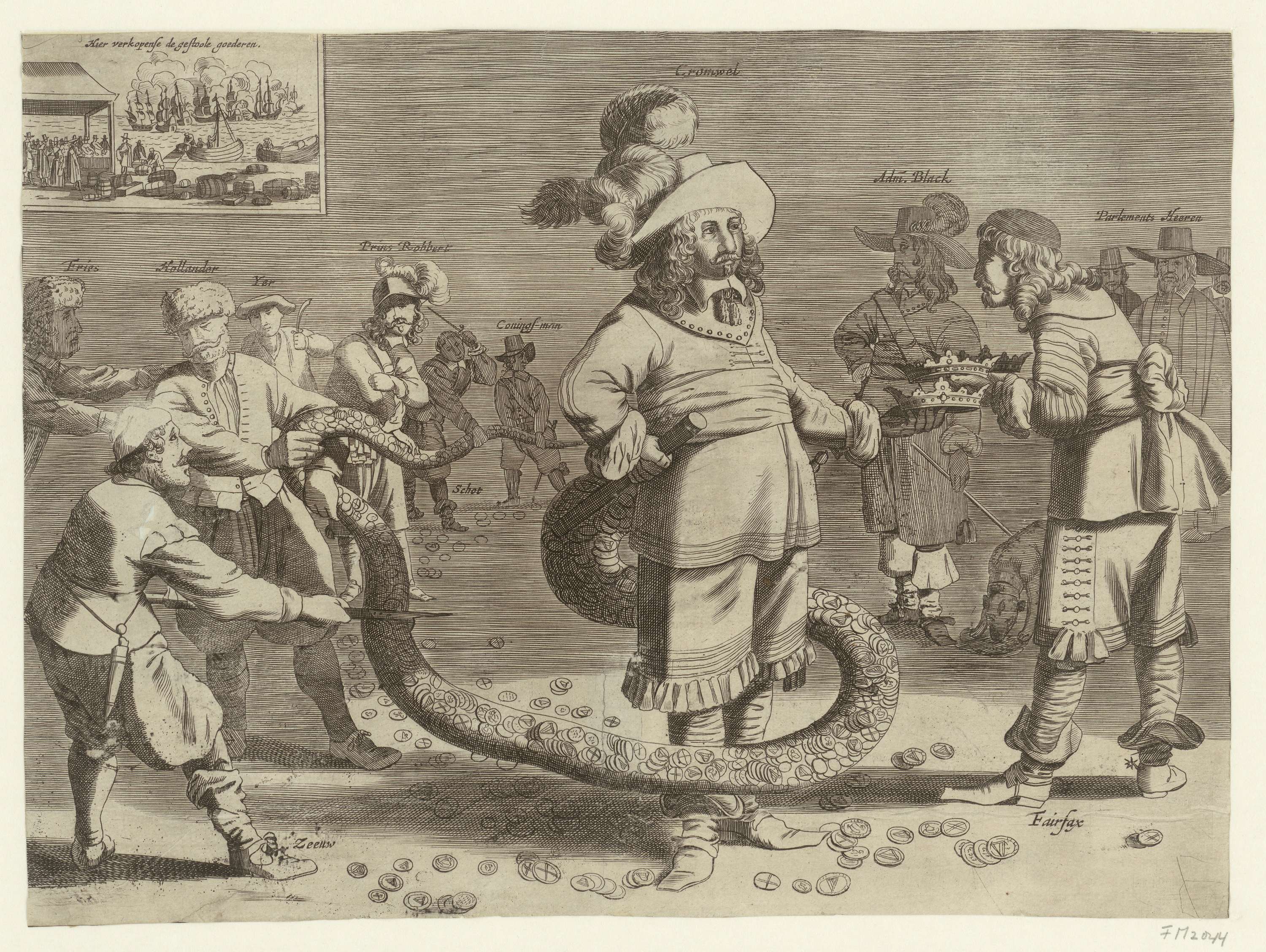 Spotprent op Cromwell als de afgrijselijke Staartman, 1652. Oliver Cromwell met een lange slangenstaart gevuld met geldstukken. Rechts biedt Fairfax hem drie kronen aan. Op de achtergrond admiraal Blake en leden van het Engelse parlement. Links snijden een Hollander en een Zeeuw de staart door, hierbij geholpen door een Fries, een Ier, prins Ruprecht, een ...