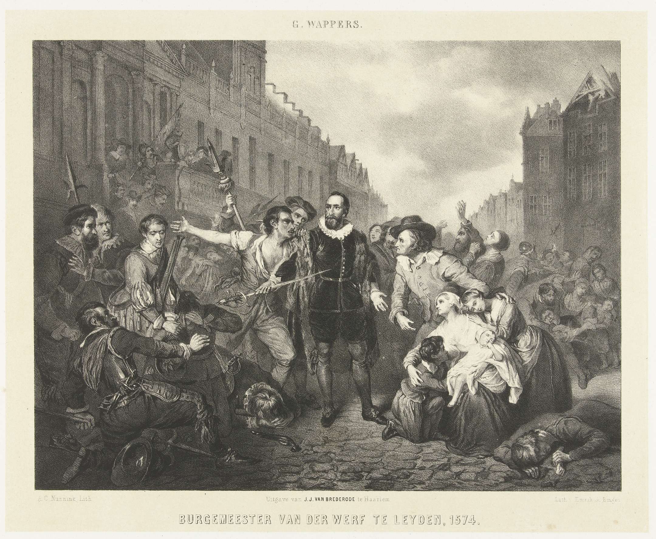 De zelfopoffering van burgemeester Pieter van der Werff tijdens het beleg van Leiden, 1574. Van der Werff staande op straat tussen wanhopige Leidenaren biedt hen zijn zwaard en lichaam aan.