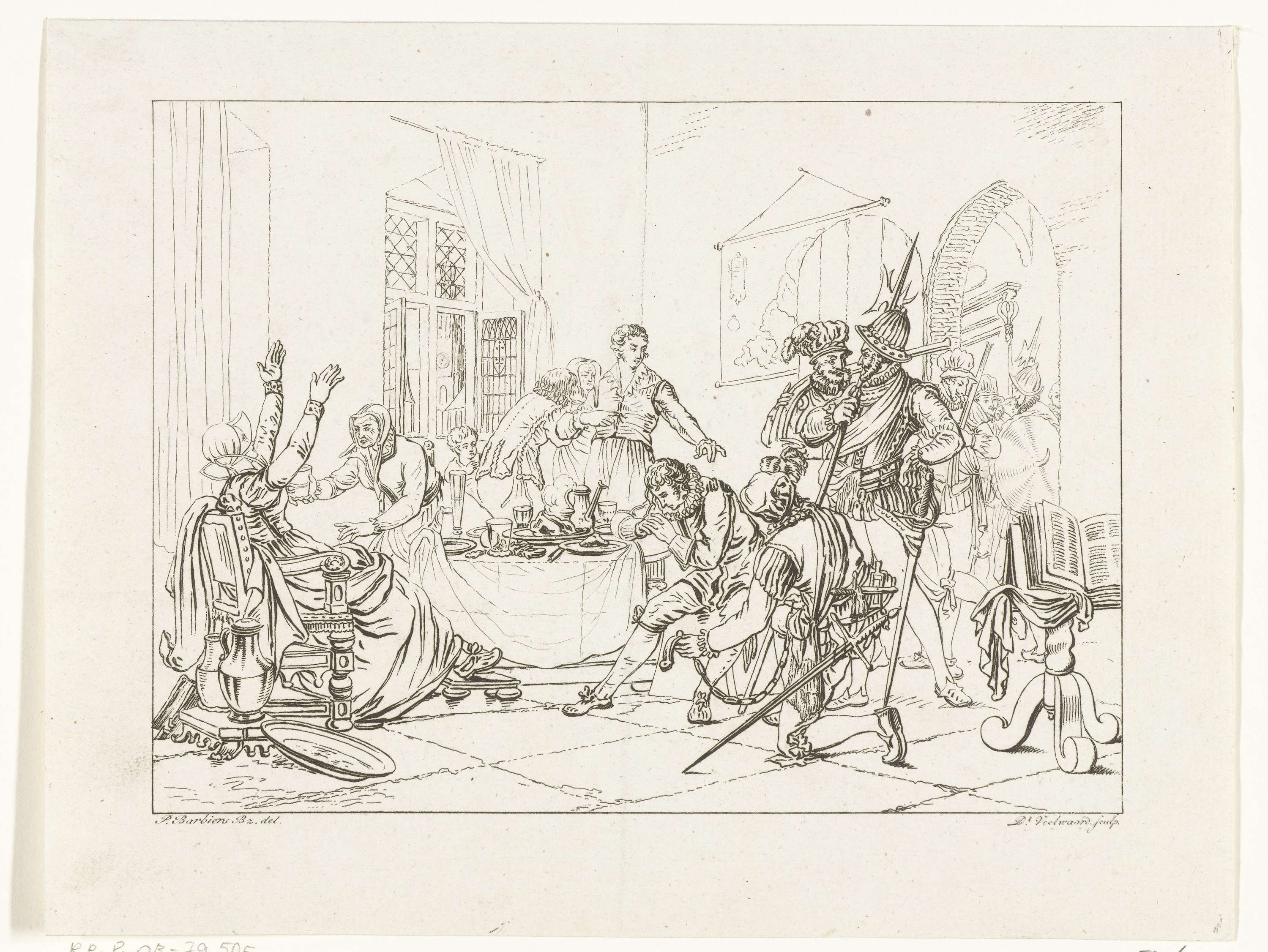 Interieur met de gevangenneming van Pieter Dirksz. Hasselaer door Spaanse soldaten in het huis van zijn moeder, augustus 1573. Links Kenau Simonsdochter Hasselaer. Het ogenblik waarop Pieter Dirksz. Hasselaer zich bekend maakte, toen de Spanjaarden zijn jongere broer Claes Dirksz. in zijn plaats wilden arresteren. Voorstelling in contouren.