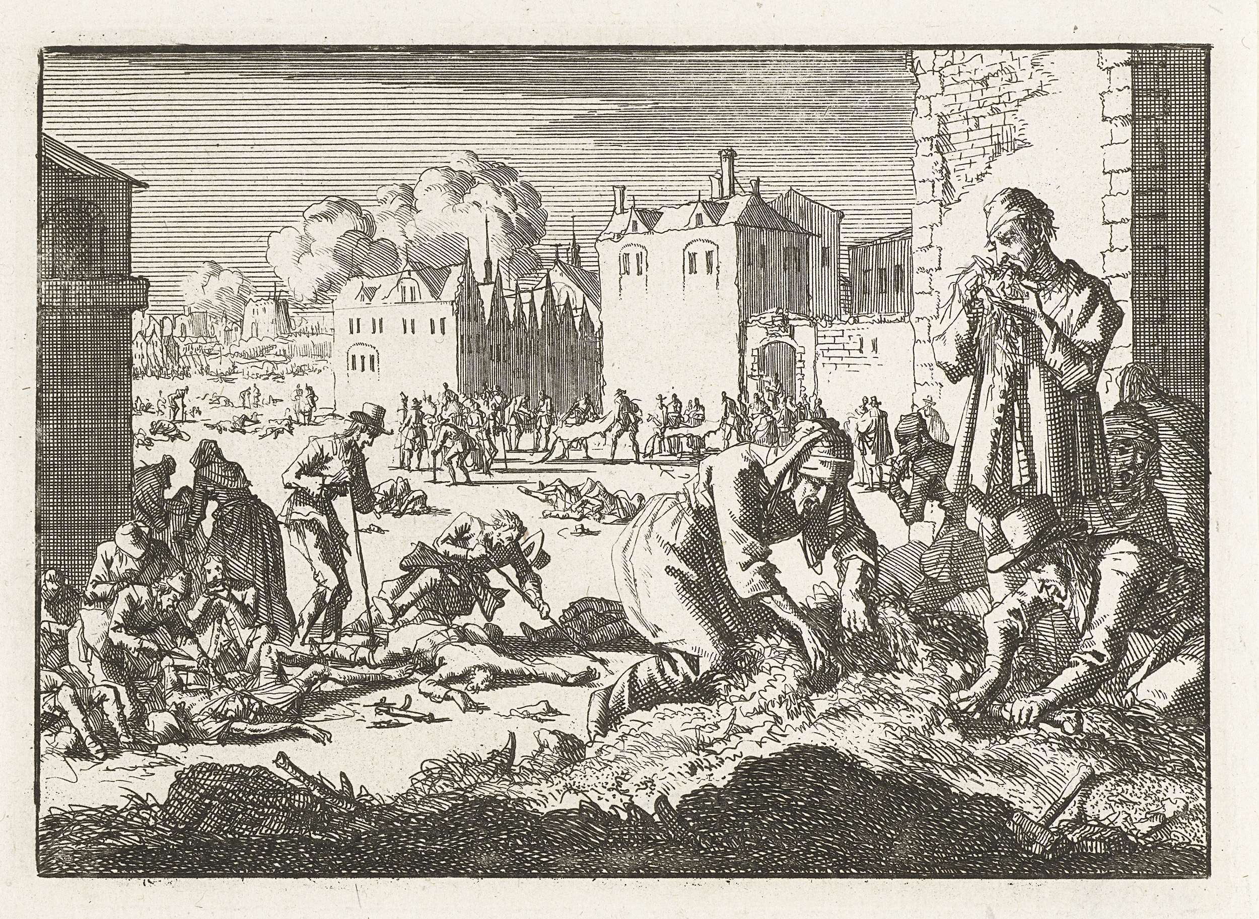 Hongersnood te Haarlem tijdens het beleg door de Spanjaarden, 1573. Op de voorgrond rechts doorzoeken mensen een vuilnishoop, links vallen mensen op straat om van de zwakte.