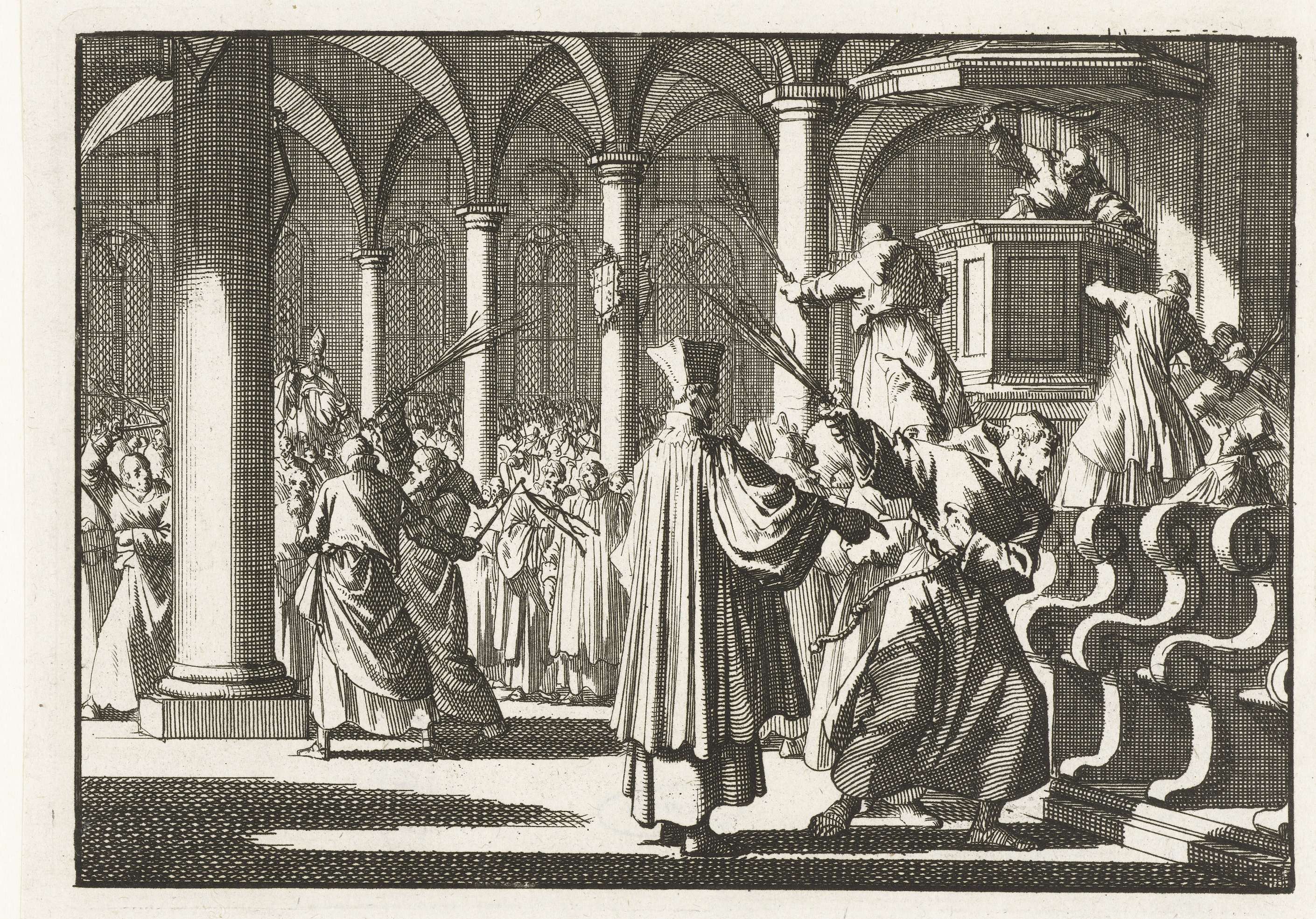 Herinwijding van de Sint-Bavo te Haarlem na de herovering van de stad door de Spanjaarden, juli 1573. Katholieke geestelijken geselen de banken, preekstoel en zuilen in het interieur van de Sint-Bavokerk te Haarlem om deze weer geschikt te maken voor de katholieke mis.