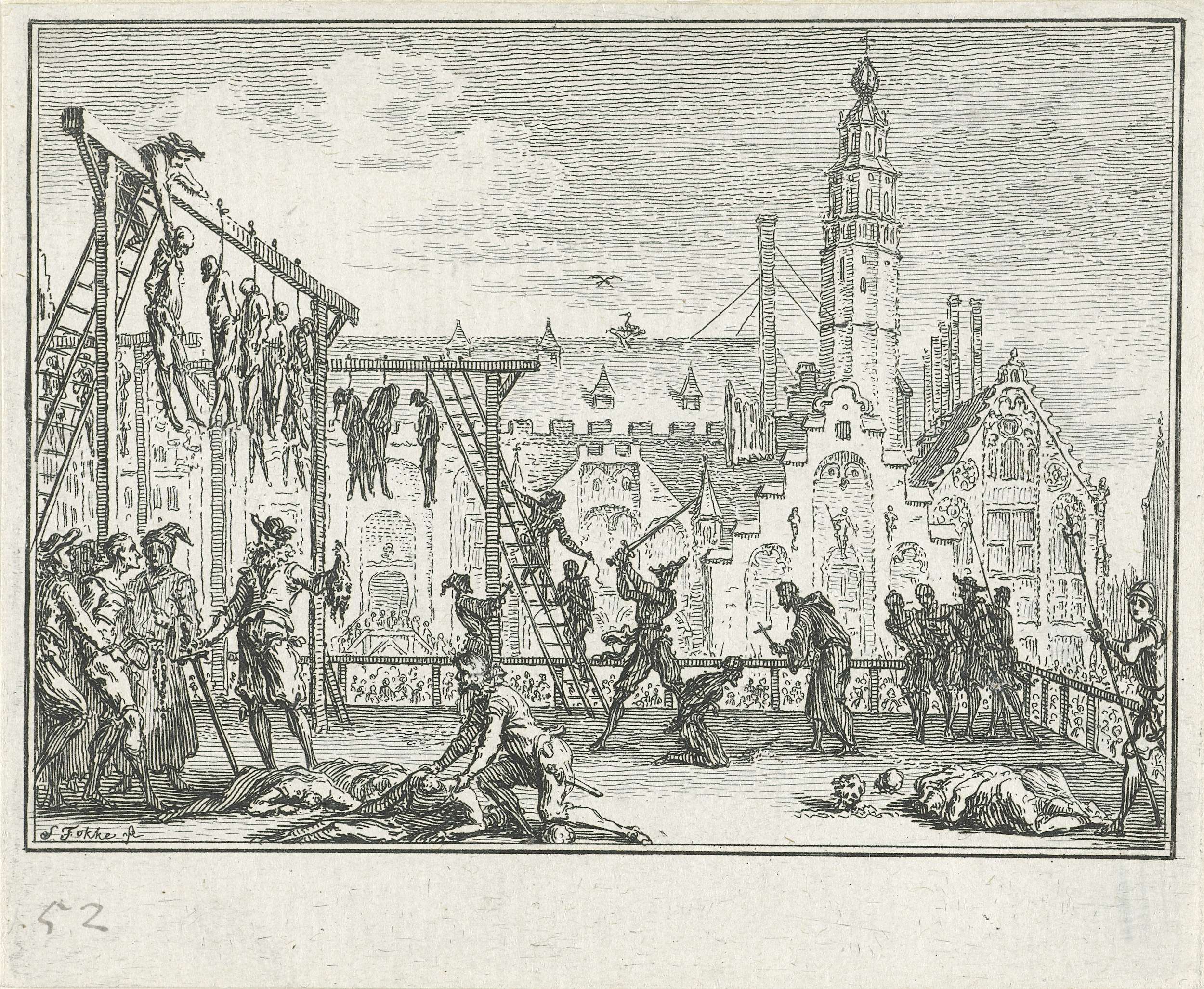 Terechtstellingen van Haarlemmers door de Spanjaarden op de Grote Markt voor het Stadhuis te Haarlem na overgave van de stad, 13 juli 1573.