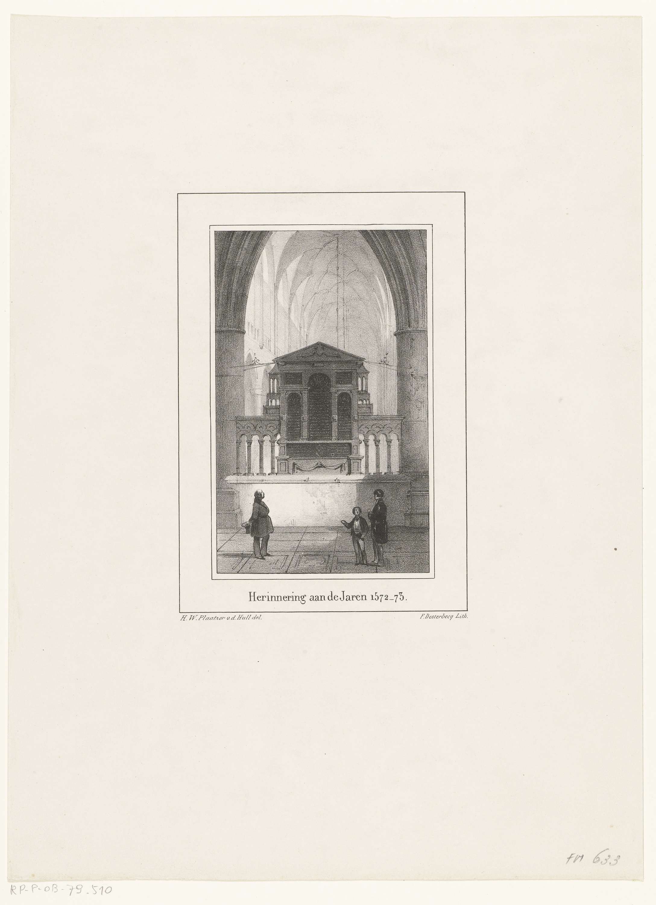 Gedenkteken aan het beleg van Haarlem in 1572-1573, opgericht in de Sint-Bavo te Haarlem. Monument in de vorm van een groot bord met tekst en bogen, opgedeeld in verschillende compartimenten. Voor het bord staan enkele bezoekers.