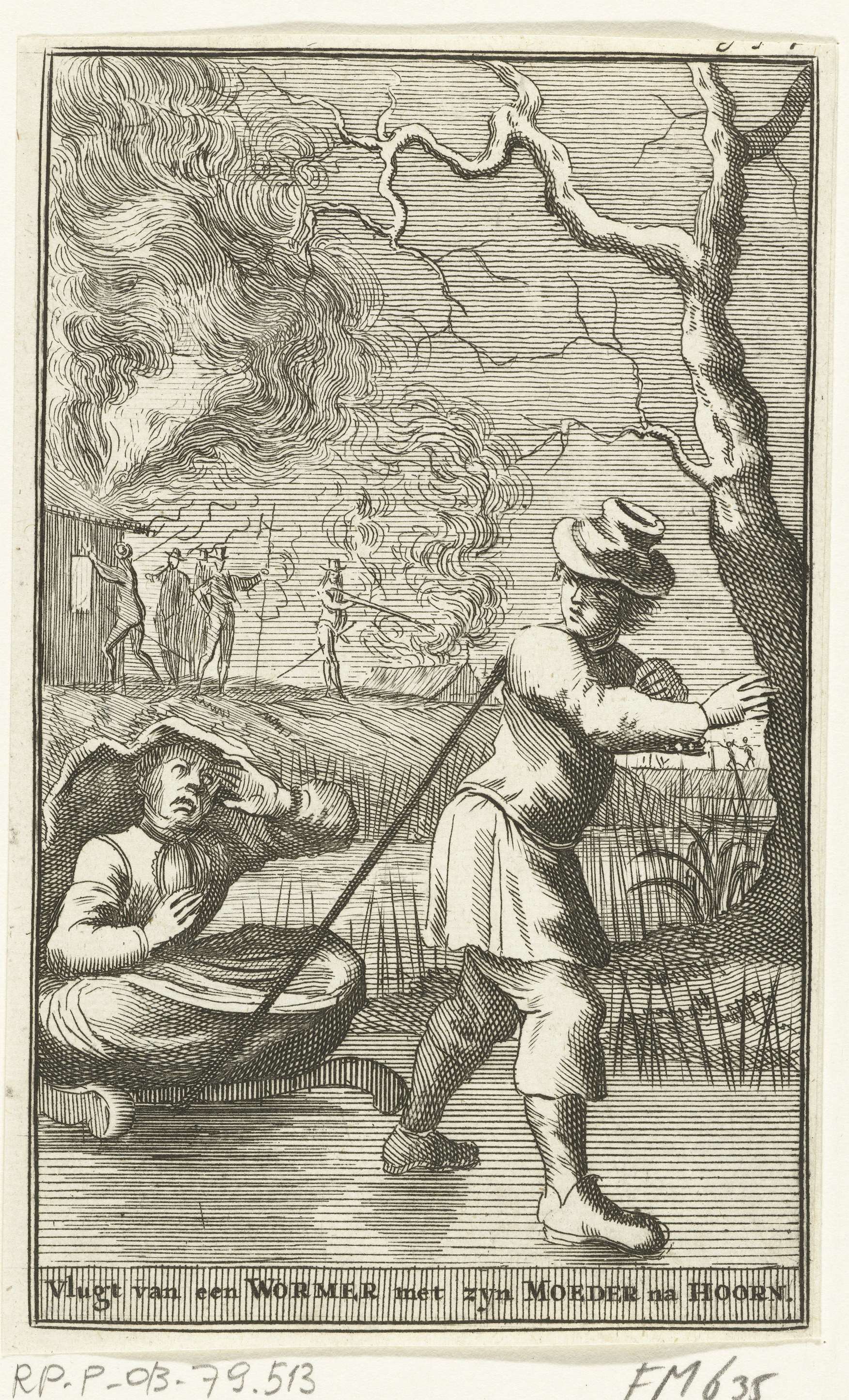 Lambert Melisz. uit Westzaan vlucht met zijn moeder in een slee over het ijs naar Hoorn, februari 1574. Op de achtergrond steken Spaanse soldaten huizen in brand.