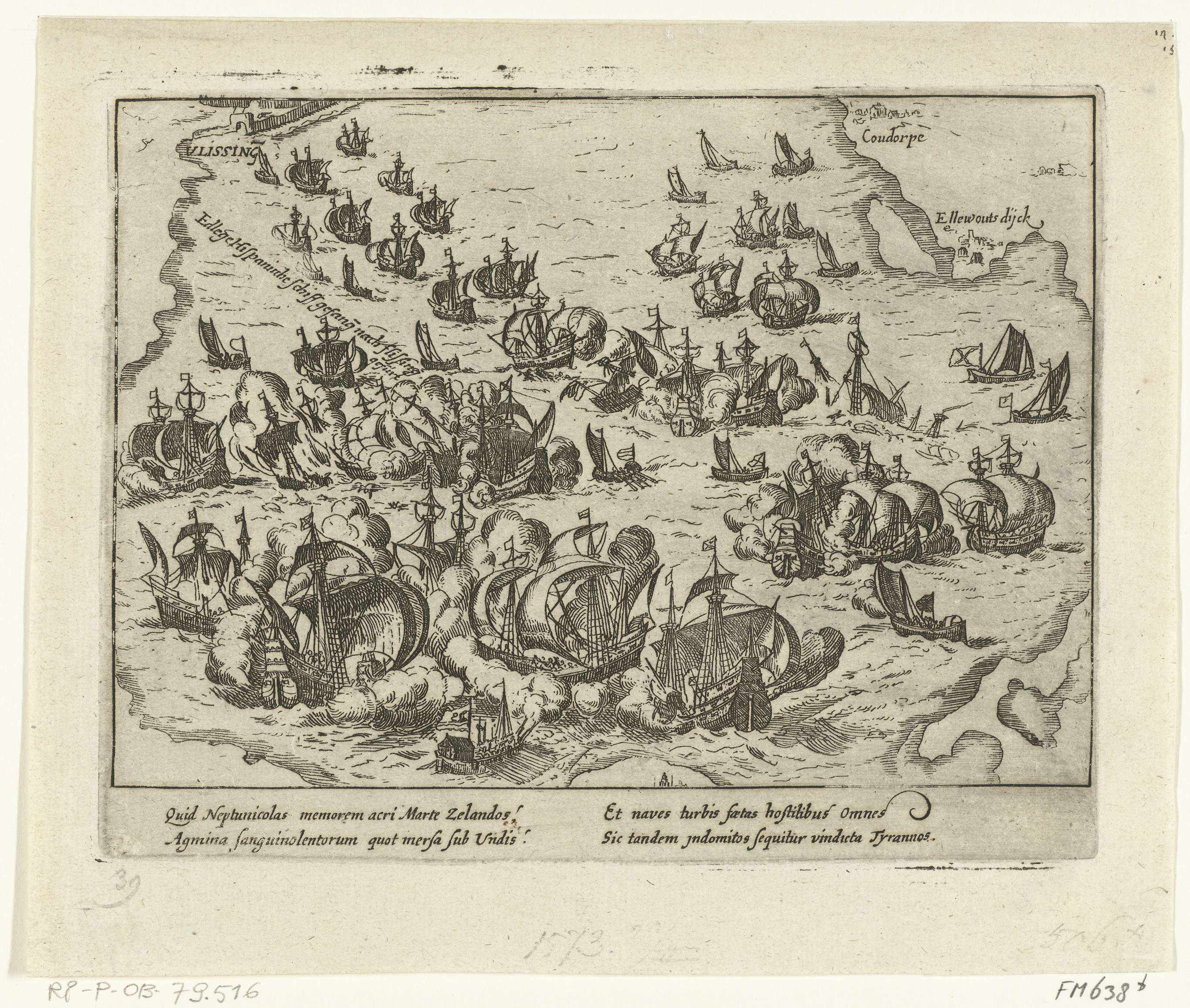Overwinning op de Spaanse vloot bij Vlissingen, 22 -23 april 1573. De Spaanse schepen die Middelburg wilden ontzetten worden door de watergeuzen verslagen op de Schelde bij Vlissingen. Met onderschrift van 4 regels in het Latijn. Genummerd: 39. De achterzijde onbedrukt.