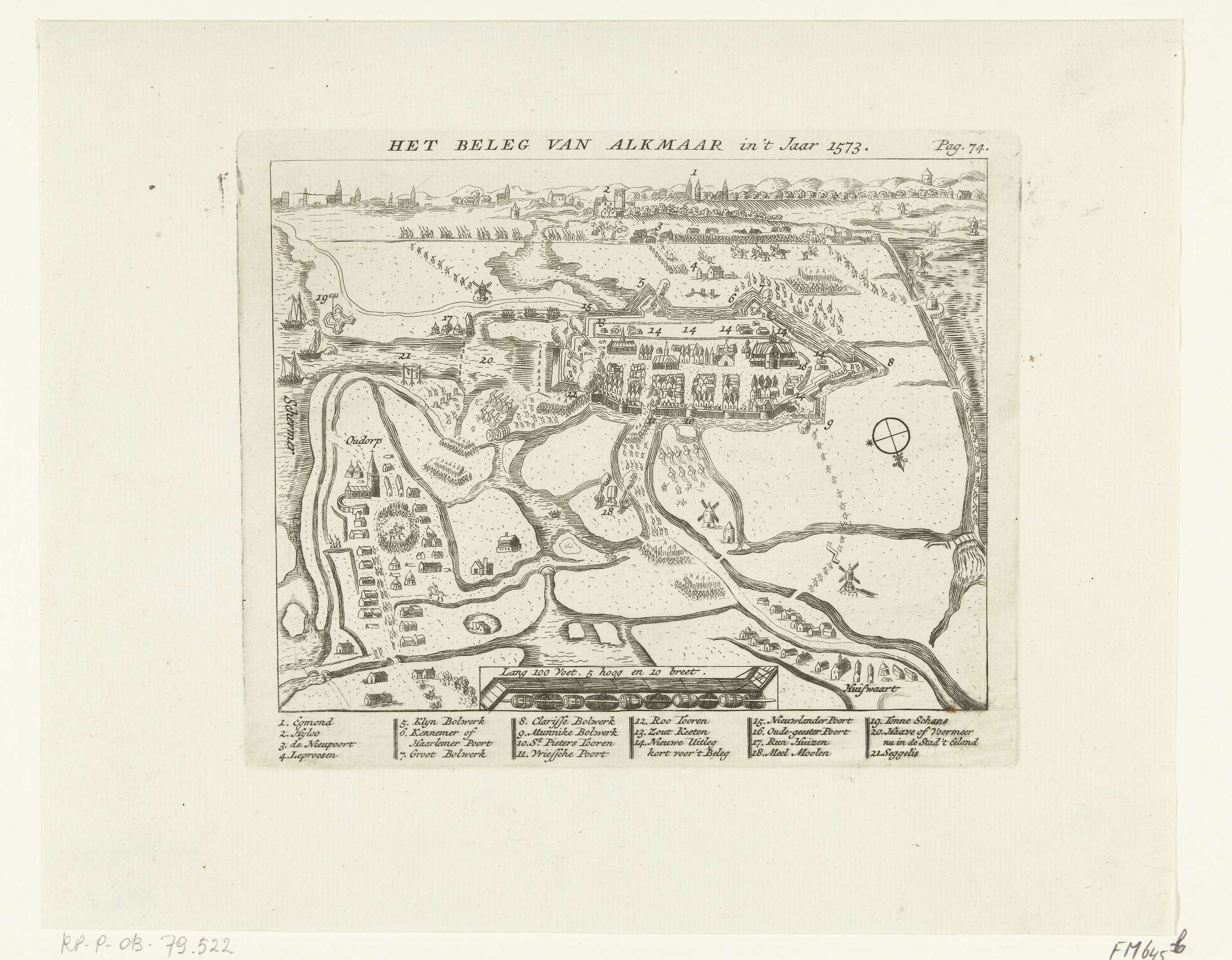 Het beleg van Alkmaar in 1573 met een plan van de stad en de omgeving met de posities van de belegerende Spaanse troepen. linksonder het legerkamp van Don Frederik te Oudorp. In het bovenschrift de Nederlandse titel, in het onderschrift de legenda 1-21. Rechtsboven: Pag. 74.