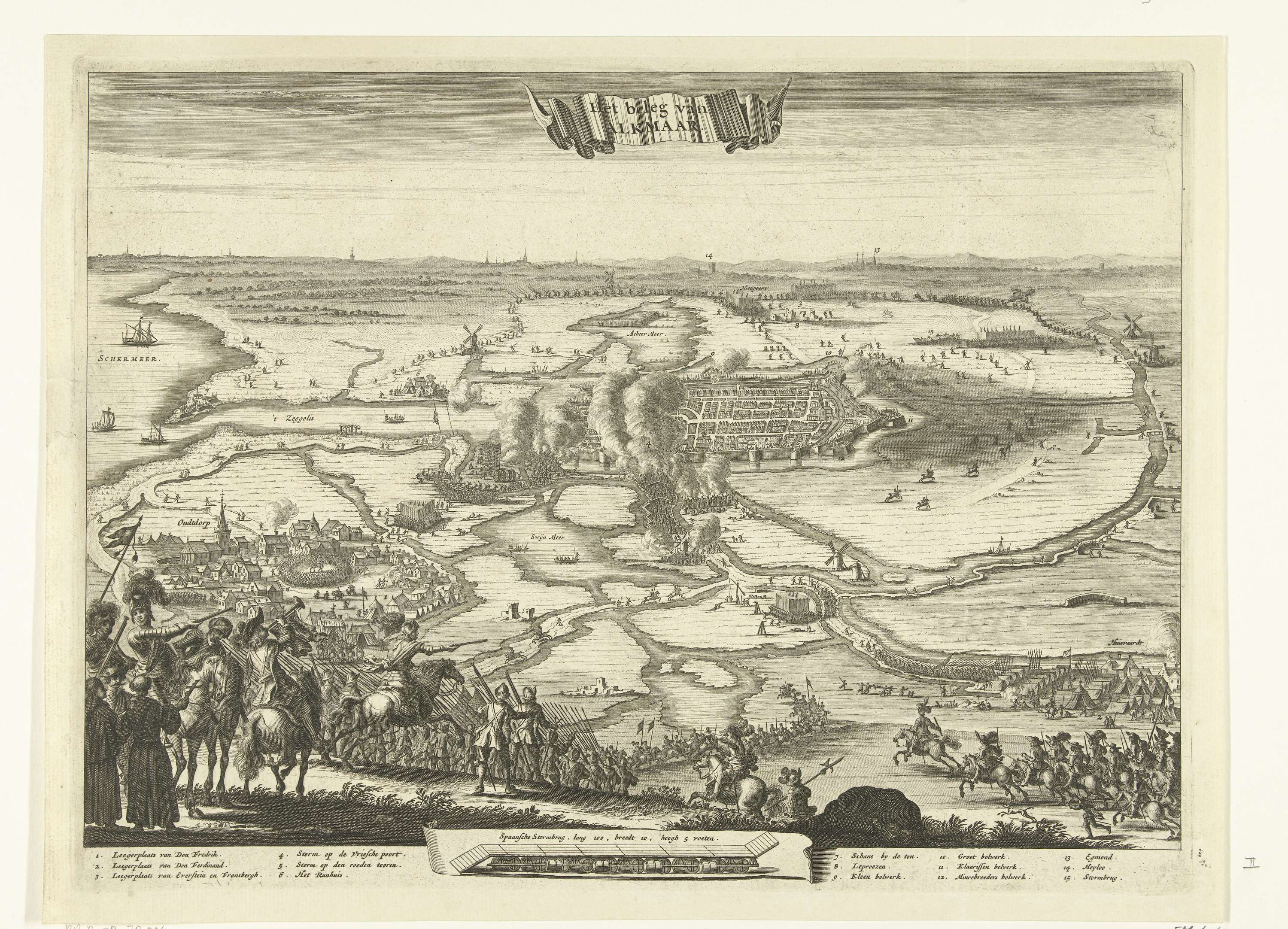 Gezicht in vogelvluchtperspectief op Alkmaar en omgeving tijdens het beleg door de Spanjaarden, 1573. Op de voorgrond Spaanse troepen en enkele monniken. Onderaan in een cartouche de Spaanse stormbrug. In het onderschrift de legenda 1-15 in het Nederlands.