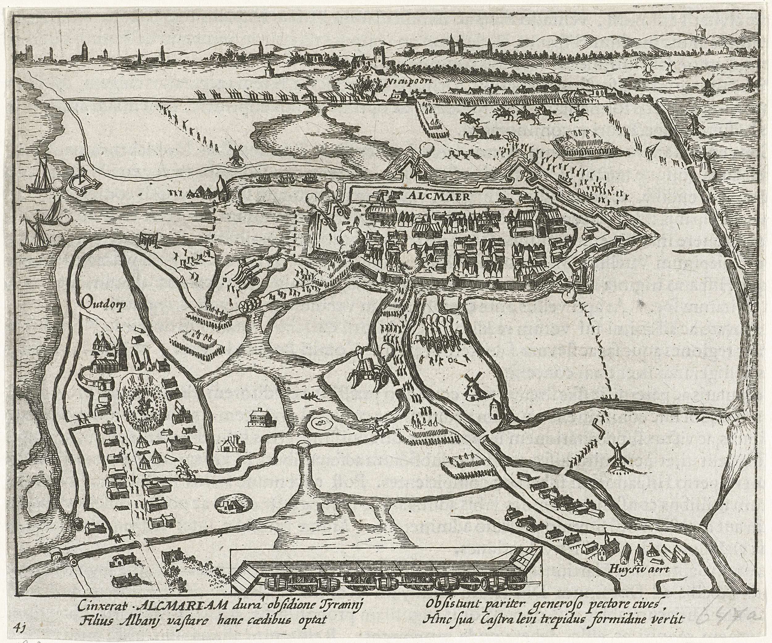 Plan van het beleg van Alkmaar, augustus en september 1573. Gezicht op de stad en het omringend gebied. Op de voorgrond de legerplaats in Oudorp van de belegerende troepen onder bevel van Don Frederik, rechts de Schermer. Met onderschrift van 4 regels in het Latijn. Genummerd: 41. Bedrukt op achterzijde met tekst in het Latijn.