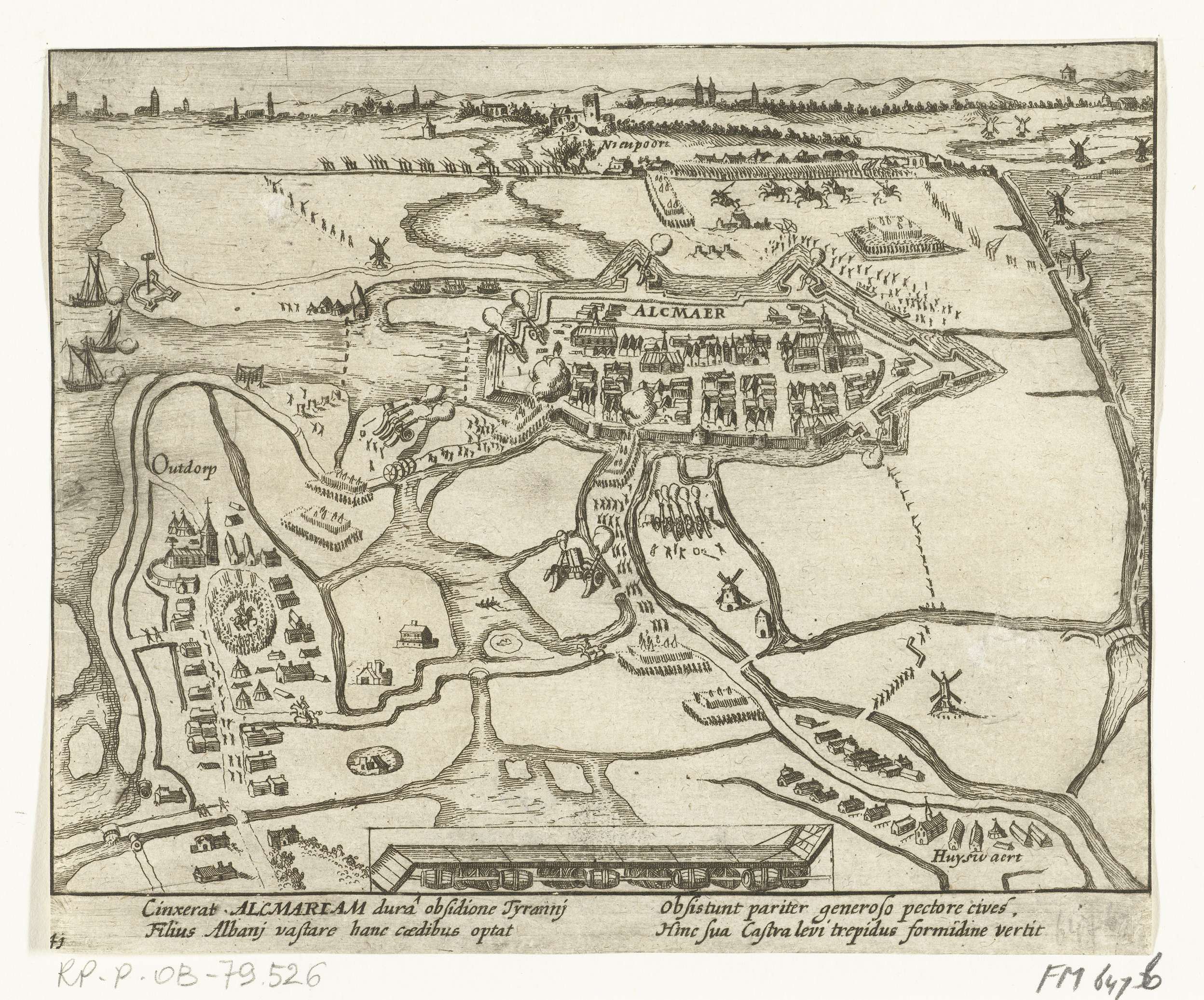 Plan van het beleg van Alkmaar, augustus en september 1573. Gezicht op de stad en het omringend gebied. Op de voorgrond de legerplaats in Oudorp van de belegerende troepen onder bevel van Don Frederik, rechts de Schermer. Met onderschrift van 4 regels in het Latijn. Genummerd: 41. De achterzijde onbedrukt.