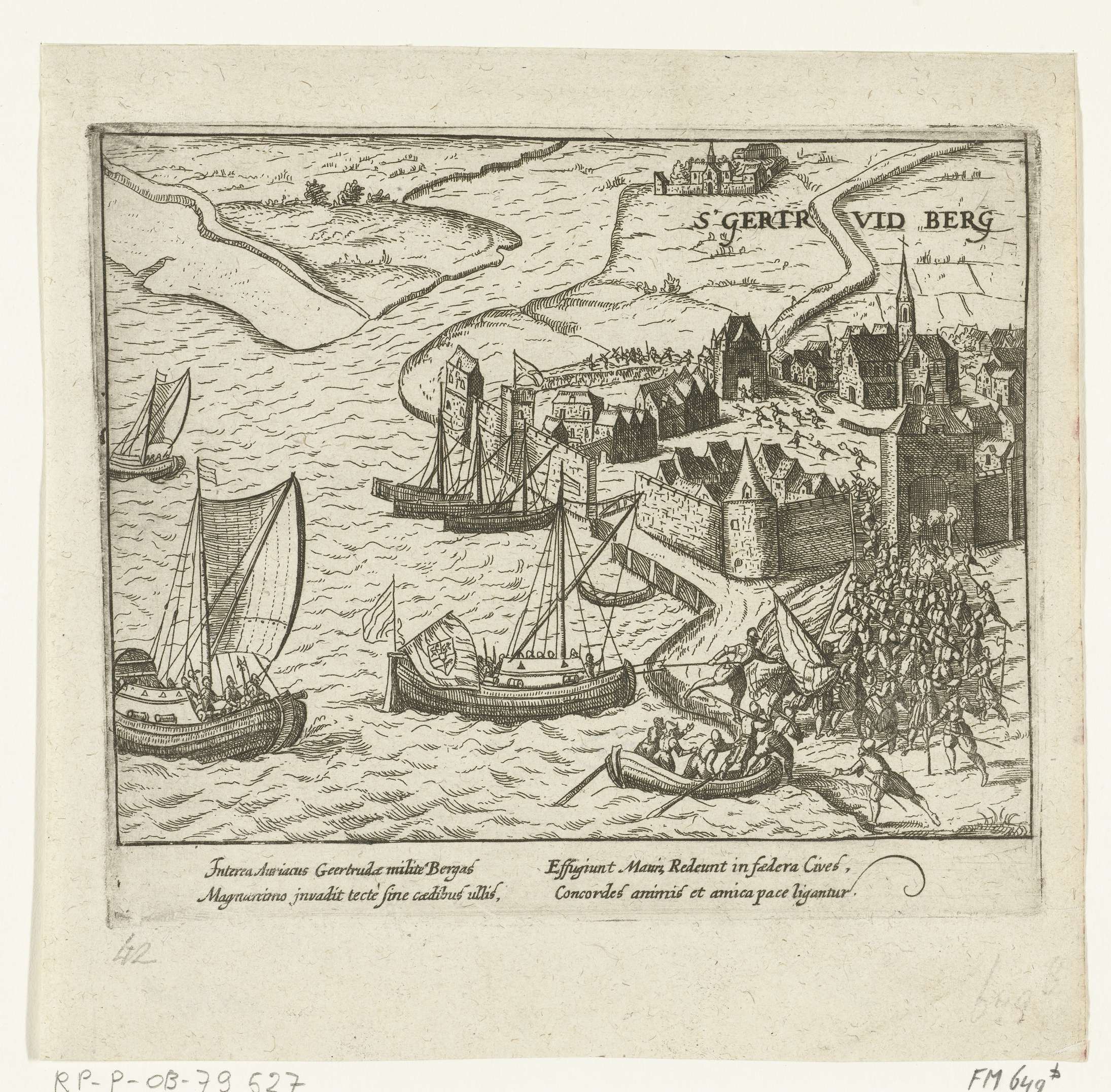 Inname van Geertruidenberg door de watergeuzen op 28 augustus 1573. Soldaten komen op de voorgrond aan land en bestormen de stad. In het water enkele kleine schepen met vlaggen. Met onderschrift van 4 regels in het Latijn. Genummerd: 42. De achterzijde onbedrukt.