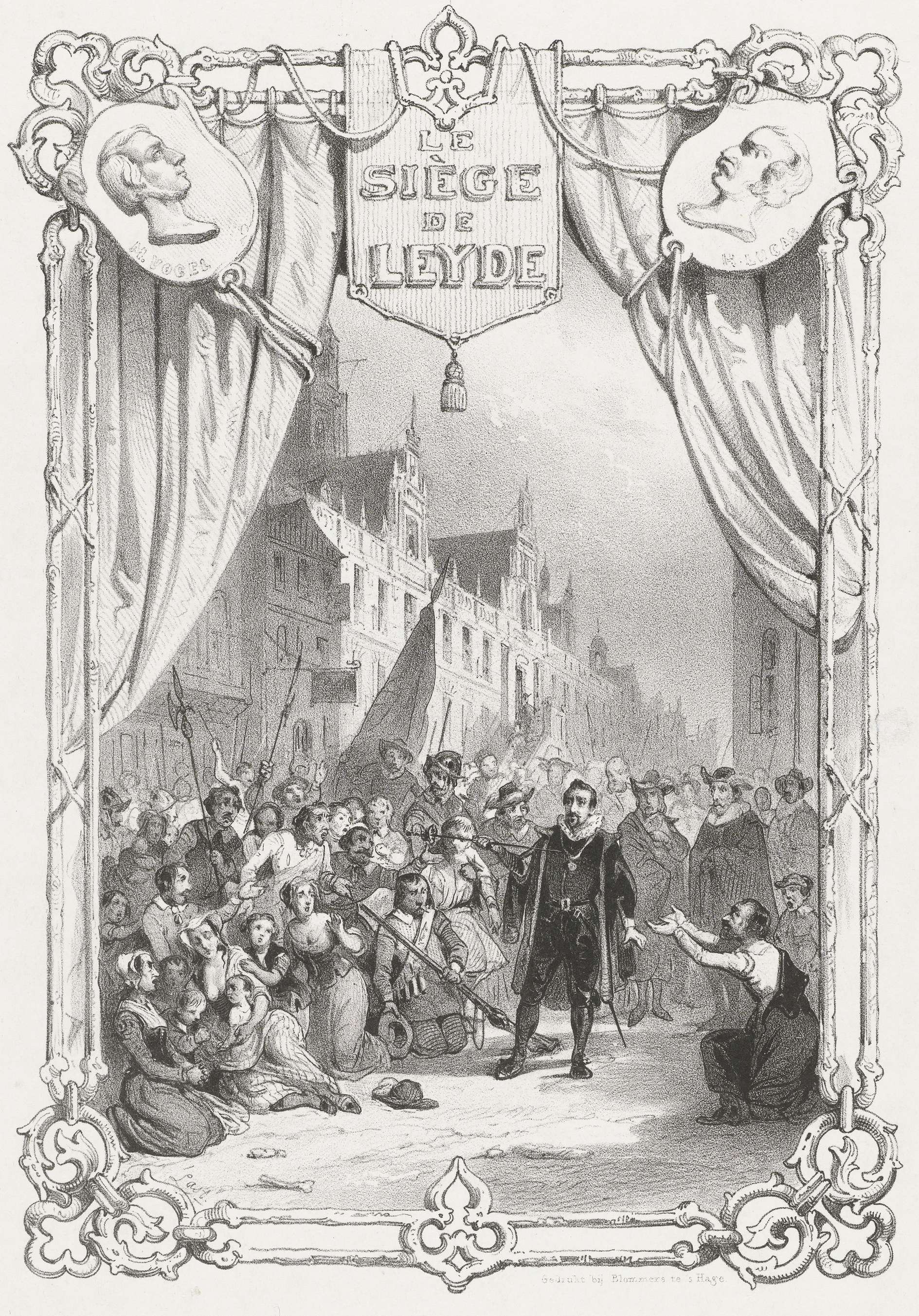 Titelplaat voor de opera Le Siège de Leyde: de zelfopoffering van burgemeester Pieter van der Werff, tijdens het beleg van Leiden, 1574. Scène op een toneel in omlijsting met gordijnen en portretten van componist M. Vogel en librettist H. Lucas.