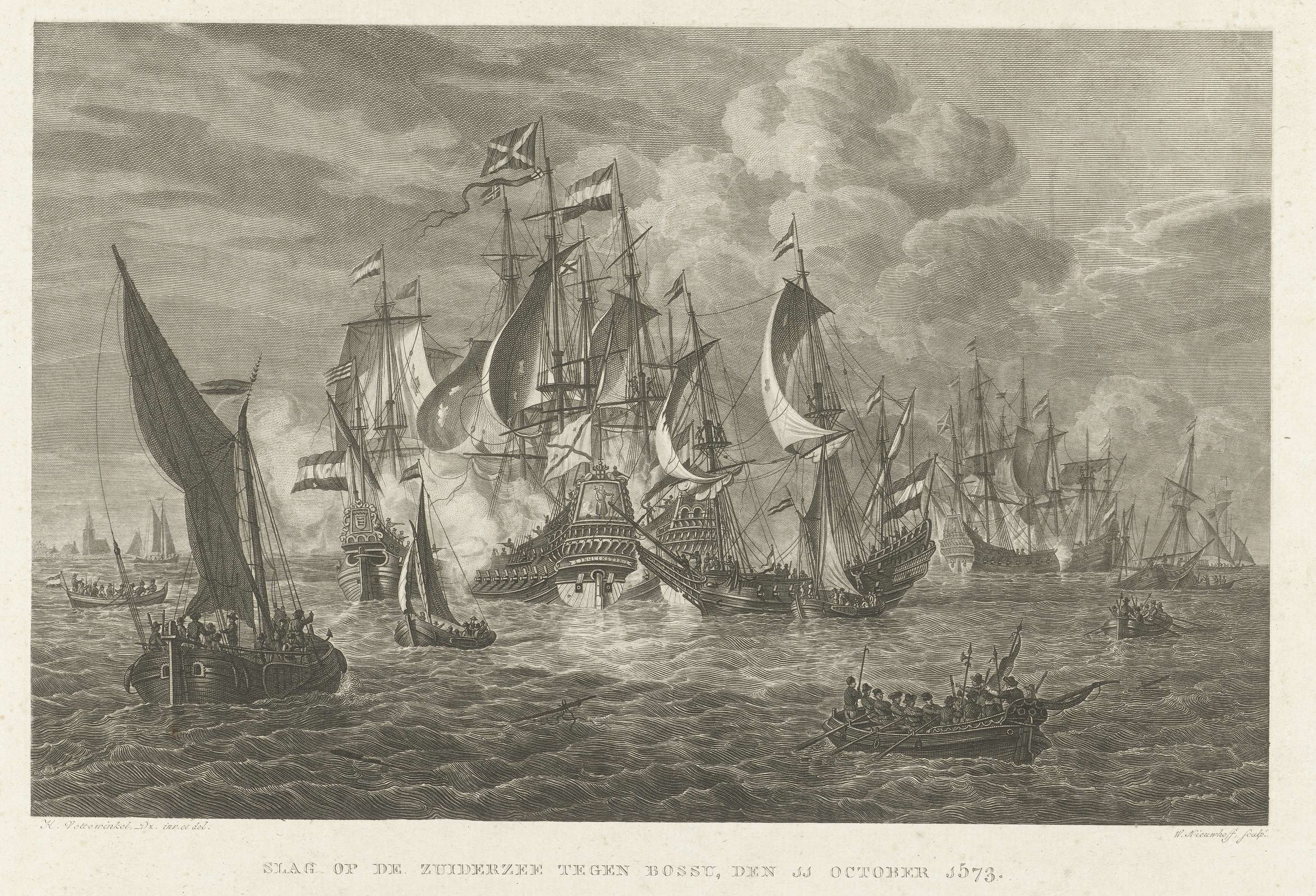 De slag op de Zuiderzee, 11 oktober 1573. Zeeslag waarbij de vloot van de watergeuzen onder leiding van Cornelis Dirkszoon van Monnickendam de Spaanse vloot van Bossu verslaat. In het midden vuren de schepen op elkaar, op de voorgrond een sloep en enkele andere kleinere vaartuigen.