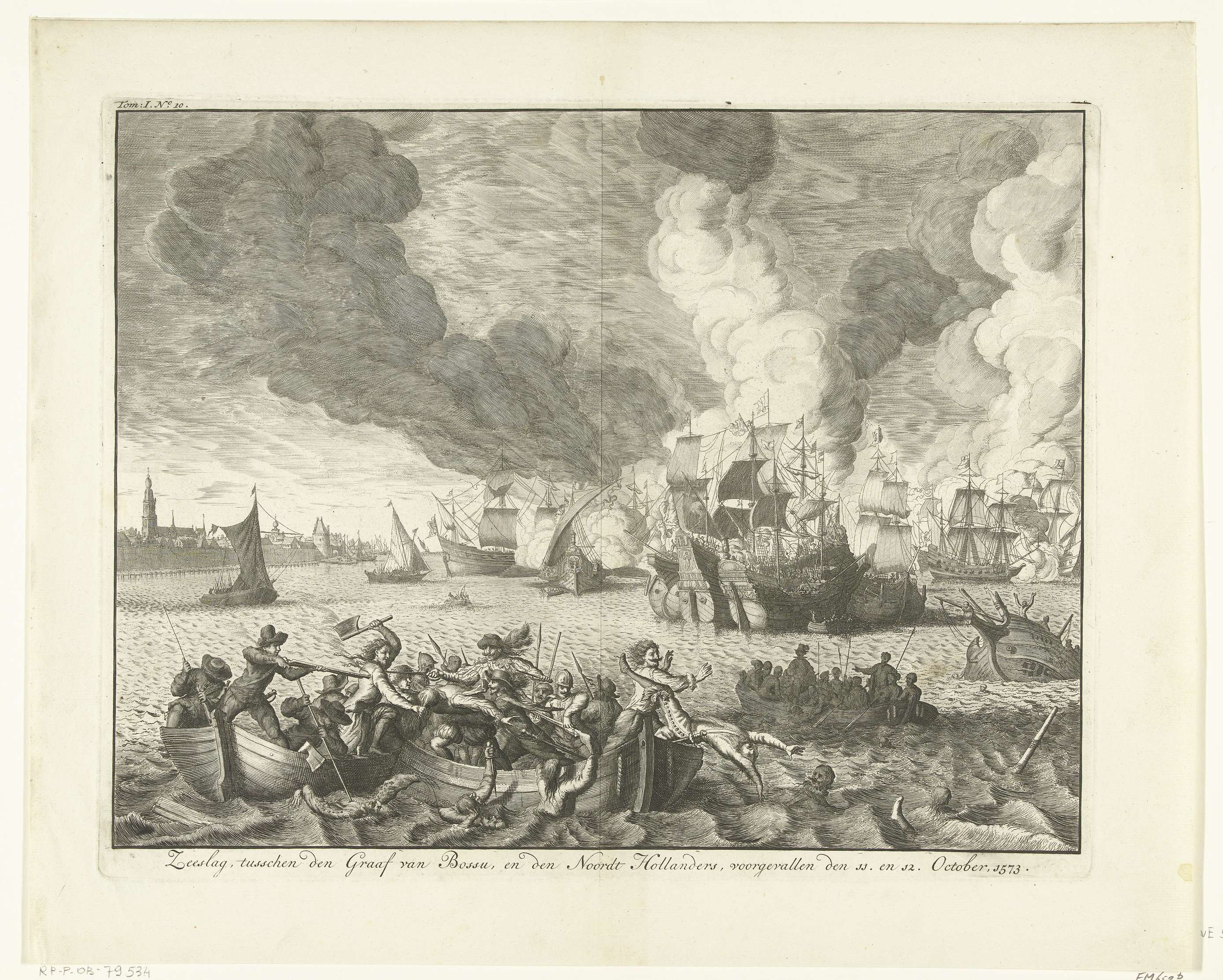 De slag op de Zuiderzee, 11 oktober 1573. Zeeslag waarbij de vloot van de watergeuzen onder leiding van Cornelis Dirkszoon van Monnickendam de Spaanse vloot van Bossu verslaat. Op de voorgrond woeste gevechten van man op man in de sloepen, daarachter de grotere schepen. Links in de verte Enkhuizen.