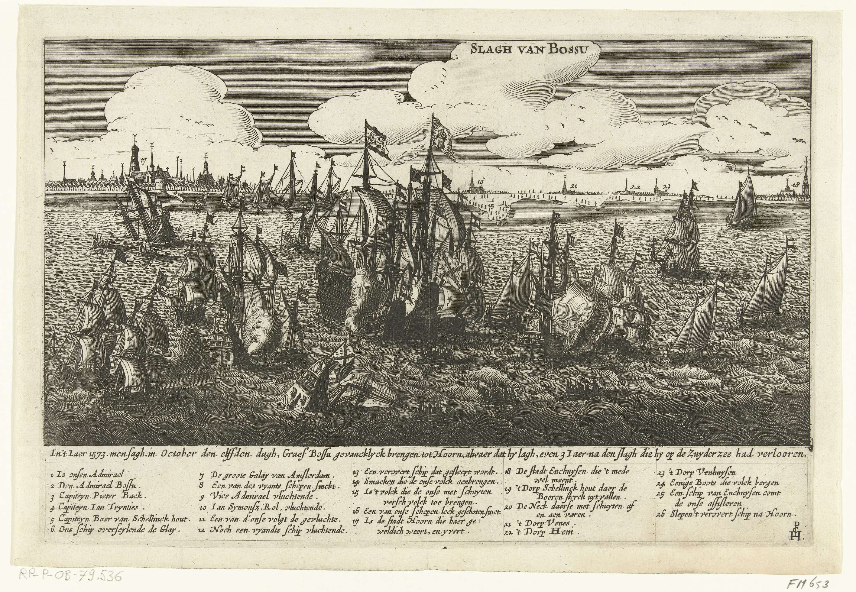 De slag op de Zuiderzee, 11 oktober 1573. Zeeslag waarbij de vloot van de watergeuzen onder leiding van Cornelis Dirkszoon van Monnickendam de Spaanse vloot van Bossu verslaat. Op de voorgrond sloepen en een zinkend schip, daarachter de grotere schepen. Op de achtergrond de kustlijn van Hoorn tot Enkhuizen. Met onderschrift van 1 regel en ...