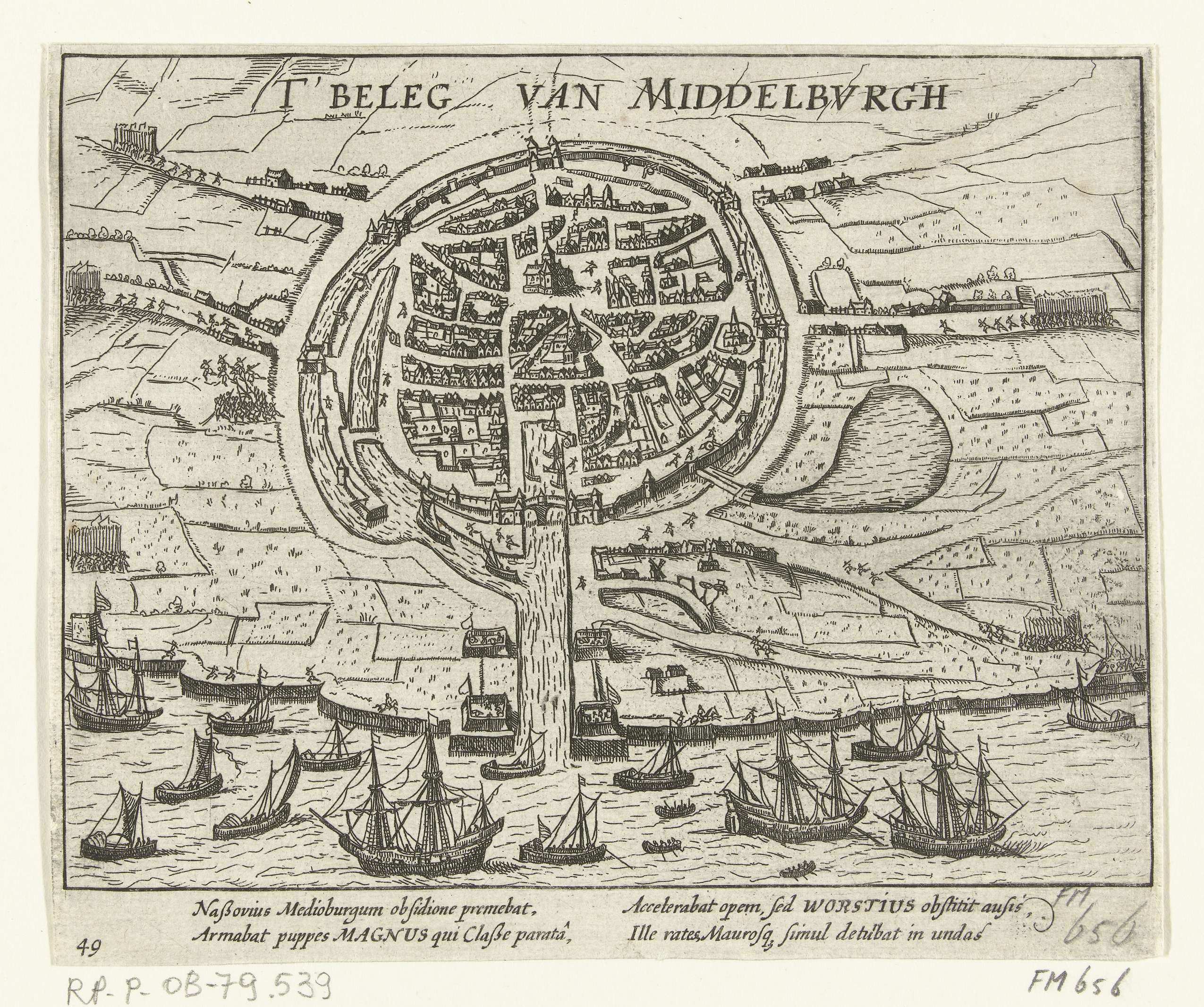 Beleg van Middelburg door de opstandelingen, januari 1574. Gezicht op de belegerde stad en de omgeving. Op de voorgrond de schepen van de geuzen, uiterst links Fort Rammekens en rechts Arnemuiden. Met onderschrift van 4 regels in het Latijn. Genummerd: 49. Bedrukt op achterzijde met tekst in het Latijn.