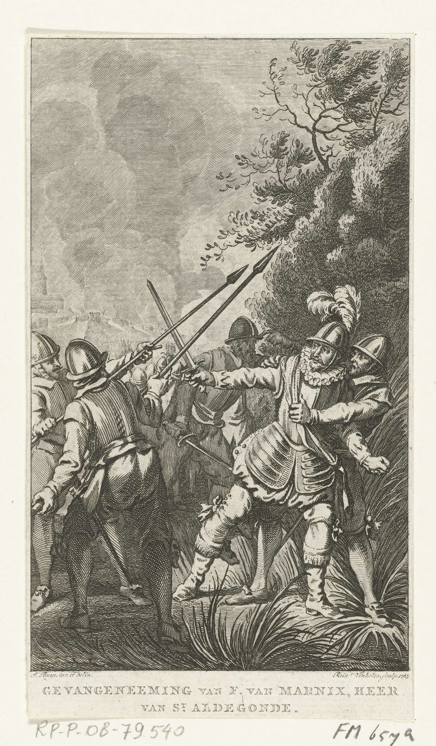 Gevangenneming van Filips van Marnix, heer van Sint-Aldegonde, door de Spanjaarden in Maaslandsluis, november 1573. Filips omringd door Spaanse soldaten, verdedigt zich met het zwaard.