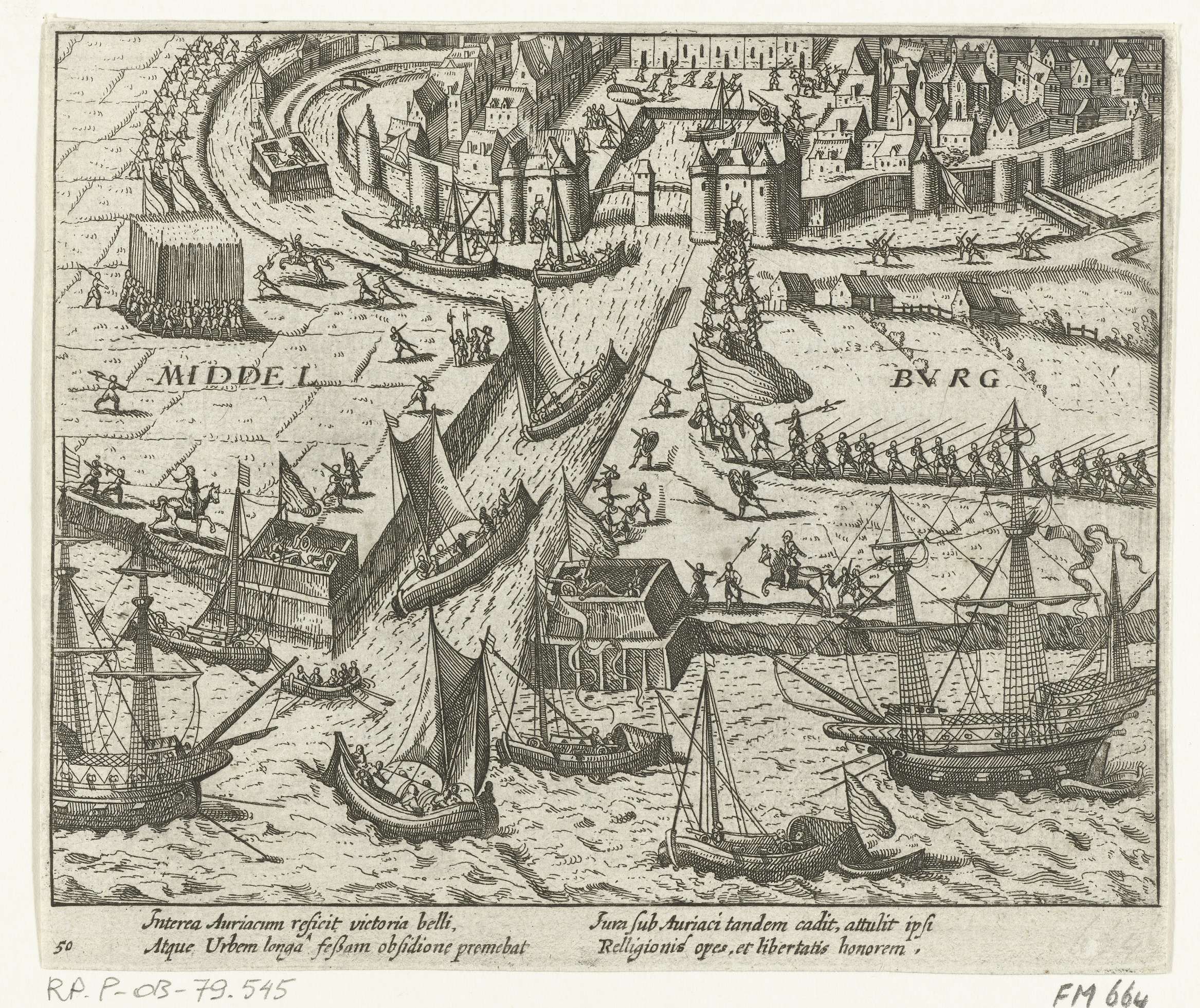 Middelburg gaat na het beleg over naar de prins, 9 februari 1574. Aankomst en binnentrekken van het leger van de prins van Oranje. Linksboven de aftocht van de Spaanse troepen onder Mondragon. Met onderschrift van 4 regels in het Latijn. Genummerd: 50. Bedrukt op achterzijde met tekst in het Latijn.