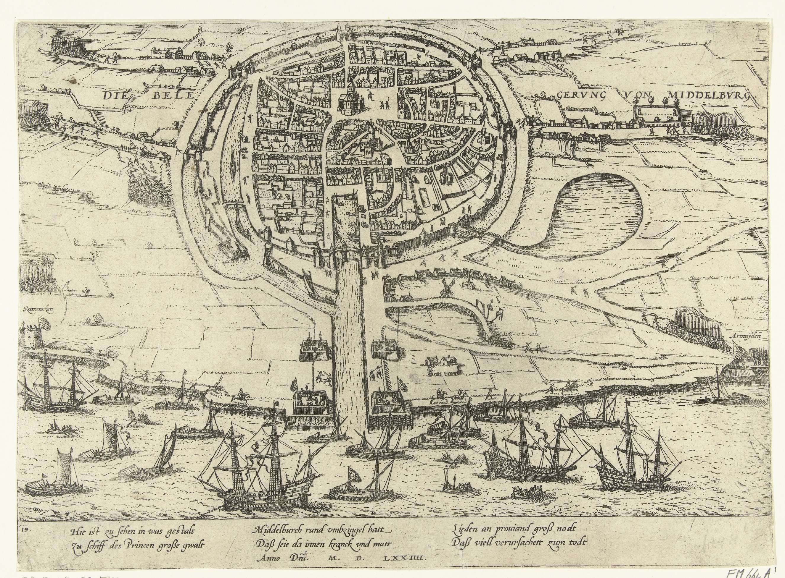 Beleg van Middelburg door de opstandelingen, januari 1574. Gezicht op de belegerde stad en de omgeving. Op de voorgrond de schepen van de geuzen, Fort Rammekens en Arnemuiden. Met onderschrift van 6 regels in het Duits. Genummerd: 19.
