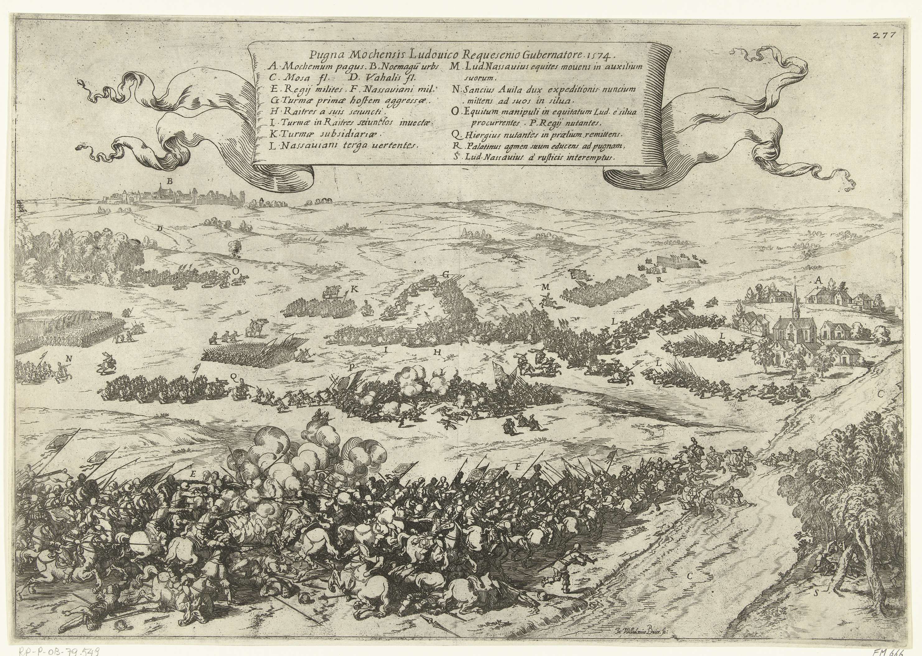 Slag op de Mookerheide op 14 april 1574. Op de voorgrond en in het midden zware gevechten tussen ruiters. Rechts het dorpje Mook, links in de verte Nijmegen. Bovenin een banderol met de titel en legenda A-S in het Latijn.