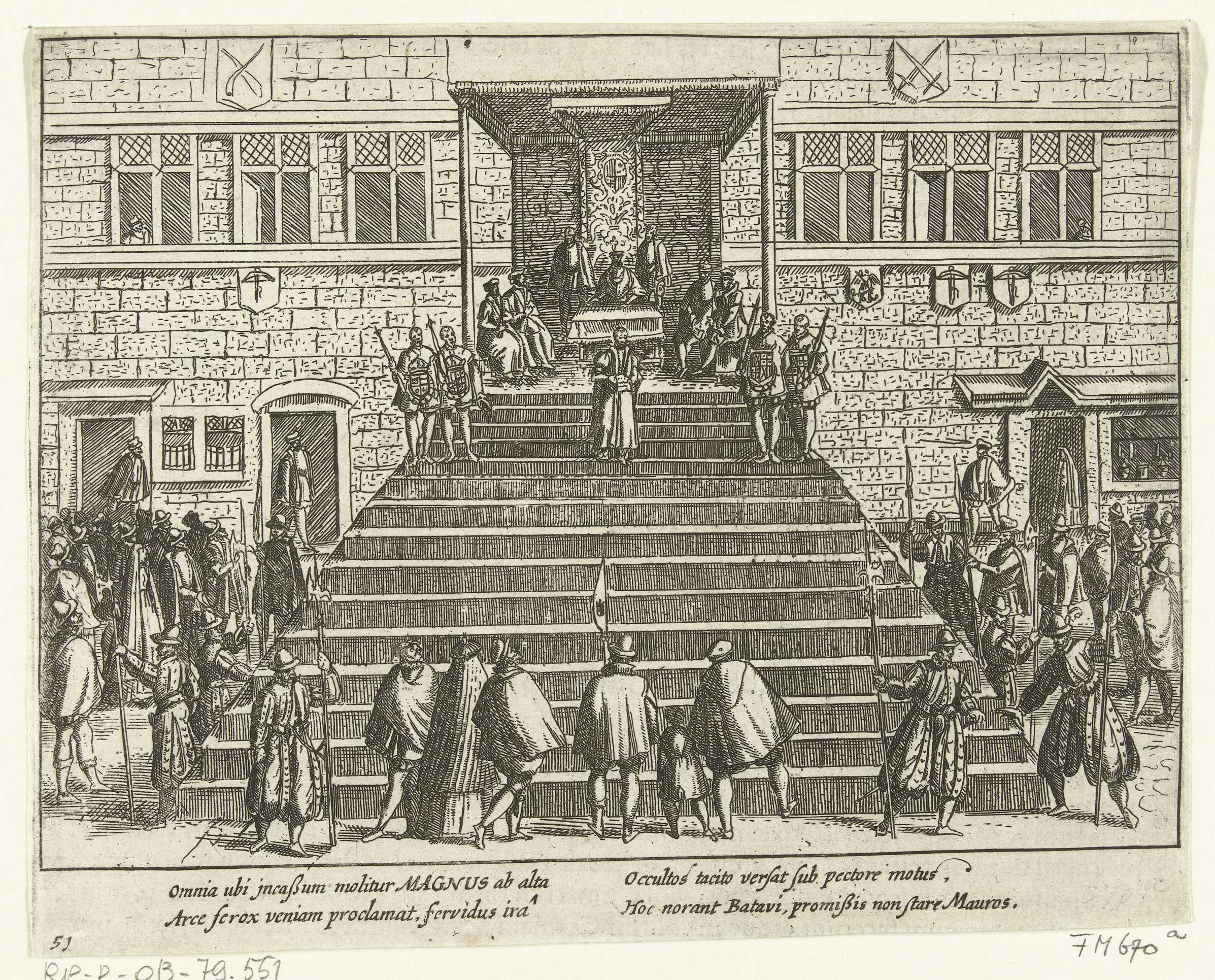 Afkondiging van het tweede Generaal Pardon, 5 april 1574. Voor het Broodhuis te Brussel laat Requesens het Generaal Pardon voorlezen. Met onderschrift van 4 regels in het Latijn. Genummerd: 51. Bedrukt op achterzijde met tekst in het Latijn.