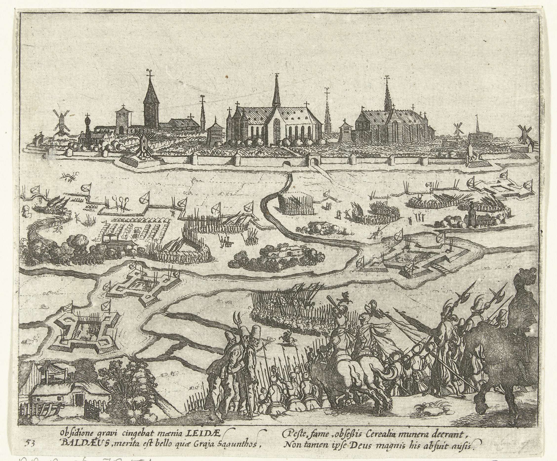 Het beleg van Leiden, 1574. Op de voorgrond rukken Spaanse troepen op naar de schansen om de belegerde stad. In de verte het profiel van de stad waarin de kerken opvallend groot zijn weergegeven. Met onderschrift van 4 regels in het Latijn. Genummerd: 53. Bedrukt op achterzijde met tekst in het Latijn.