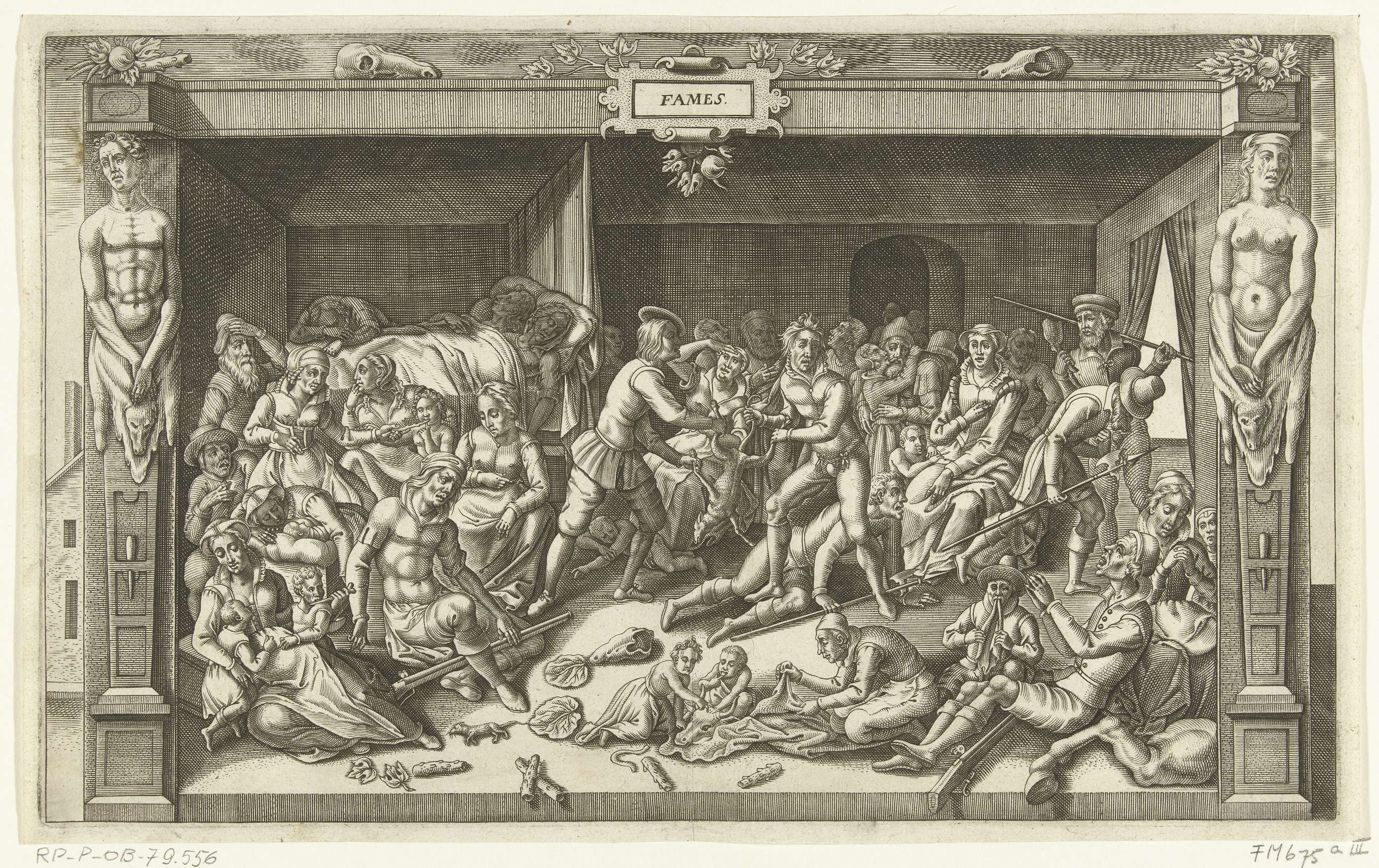 Hongersnood onder de Leidenaren, tijdens het beleg van Leiden, 1574. Interieur met groep Leidse mannen en vrouwen die honger lijden, sterven van uitputting en honger en vechten om het schaarse voedsel. In gebeeldhouwde omlijsting met hermen aan weerszijden.