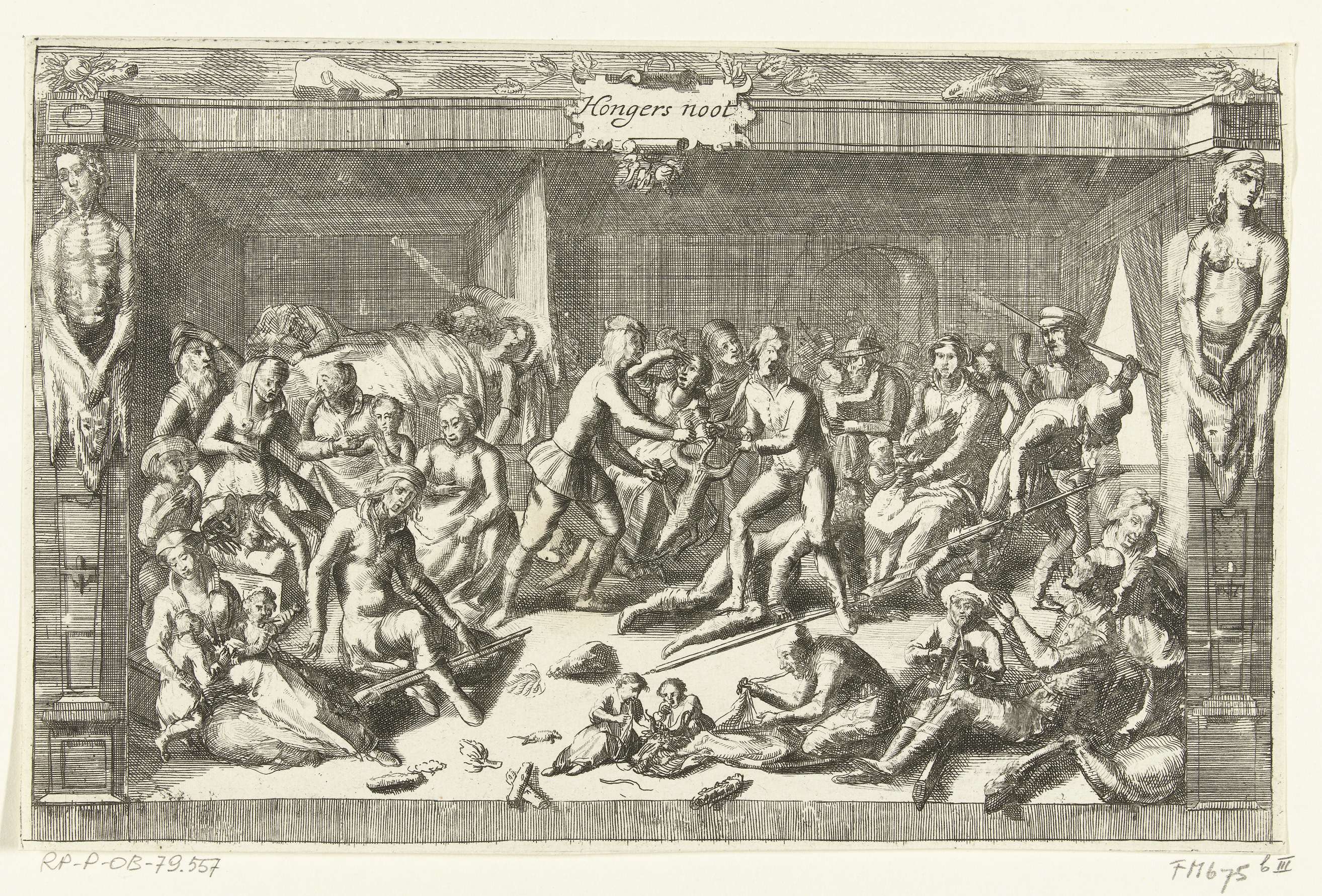 Hongersnood onder de Leidenaren, tijdens het beleg van Leiden, 1574. Interieur met groep Leidse mannen en vrouwen die honger lijden, sterven van uitputting en honger en vechten om het schaarse voedsel. In gebeeldhouwde omlijsting met hermen aan weerszijden.