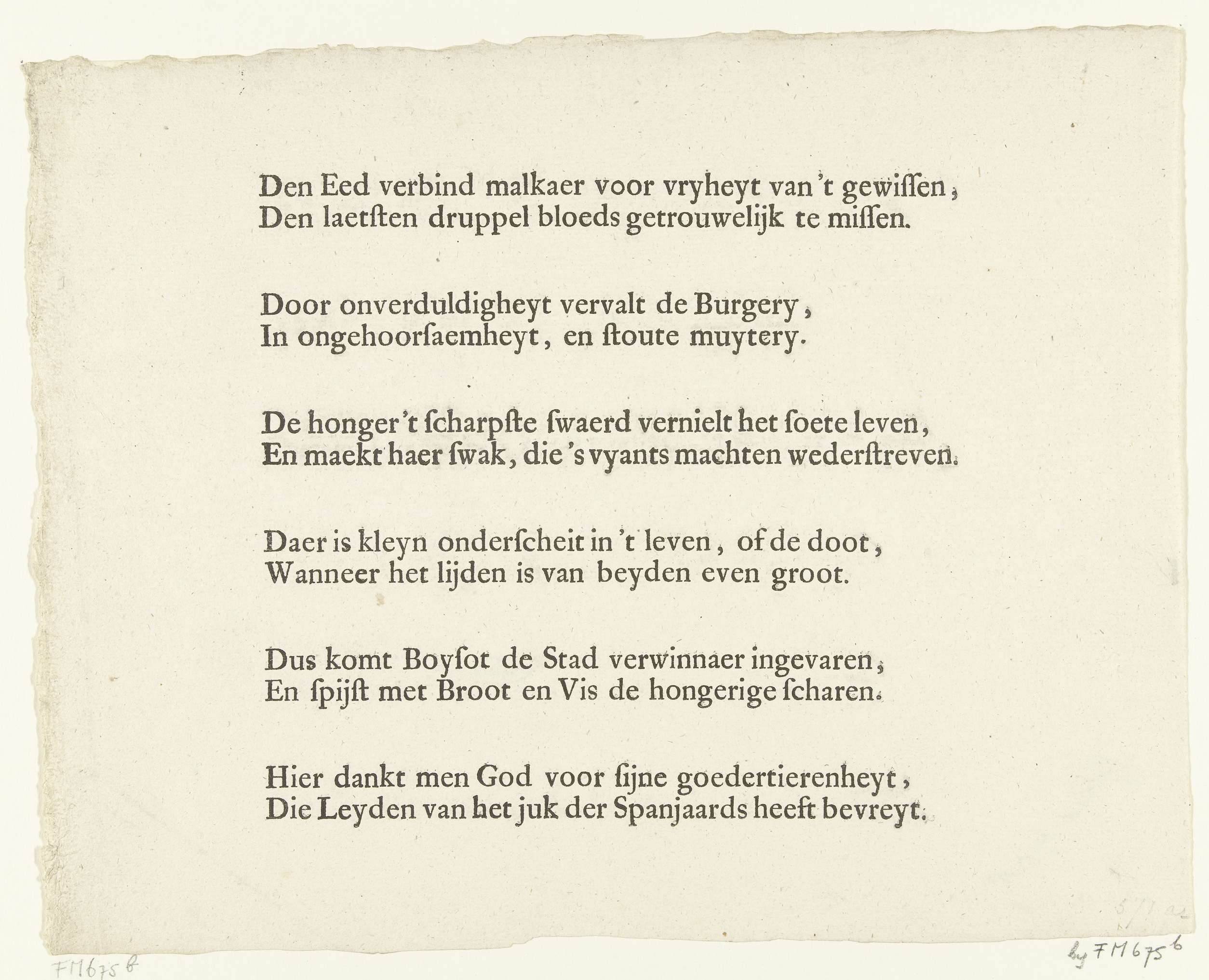 Blad met zes tweeregelige verzen over het beleg en ontzet van Leiden, 1574. Waarschijnlijk behorend bij de serie: Leiden tijdens het beleg en ontzet, 1574 (kopieën).