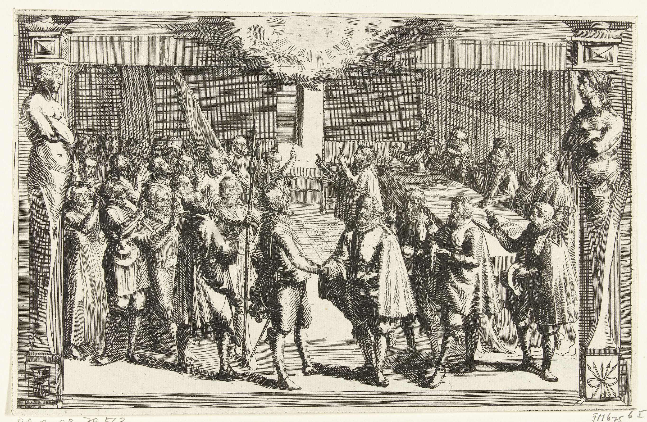 Afleggen van de eed van getrouwheid tijdens het beleg van Leiden, 1574. Interieur met groep staande Leidse mannen en vrouwen die trouw zweren aan de prins van Oranje. Bovenaan een wolk. In gebeeldhouwde omlijsting met hermen aan weerszijden.
