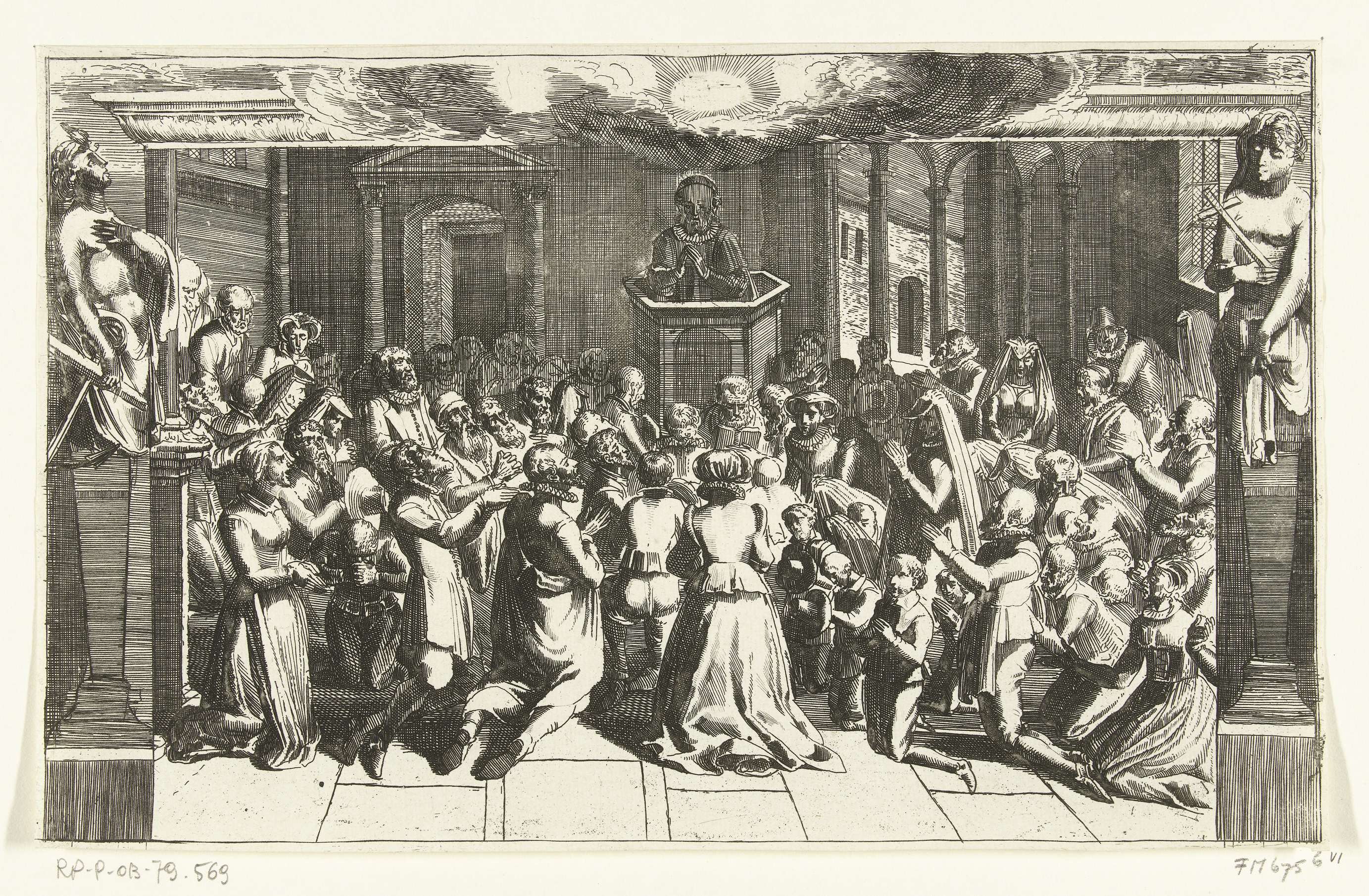 Leidenaren knielen in dankbaarheid tijdens een kerkdienst na het ontzet van de stad, 1574. Boven de predikant een wolk. In gebeeldhouwde omlijsting met hermen aan weerszijden.
