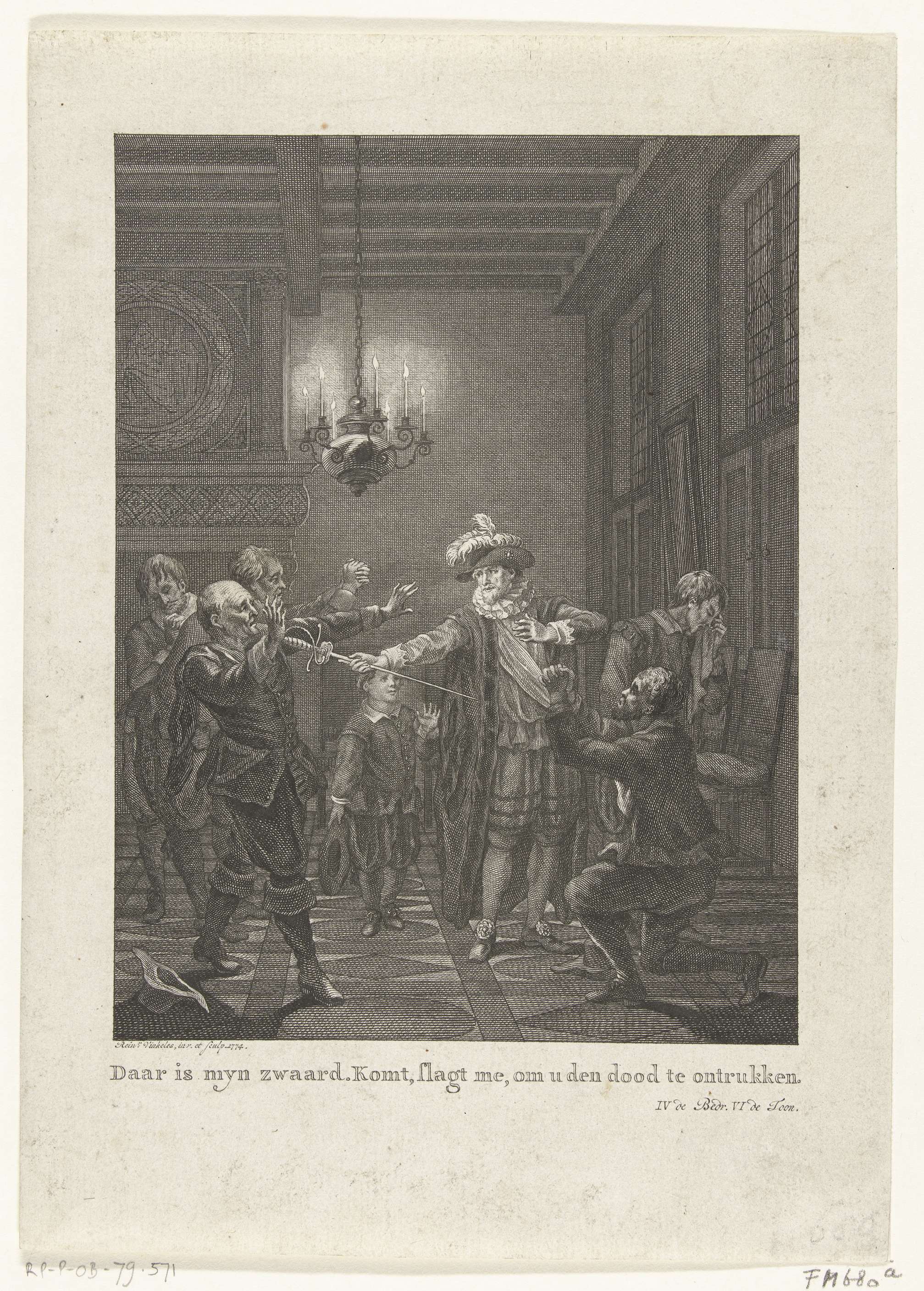 De zelfopoffering van burgemeester Pieter van der Werff, tijdens het beleg van Leiden, 1574. Interieur met Van der Werff die omstanders het zwaard aanreikt, bij kaarslicht.