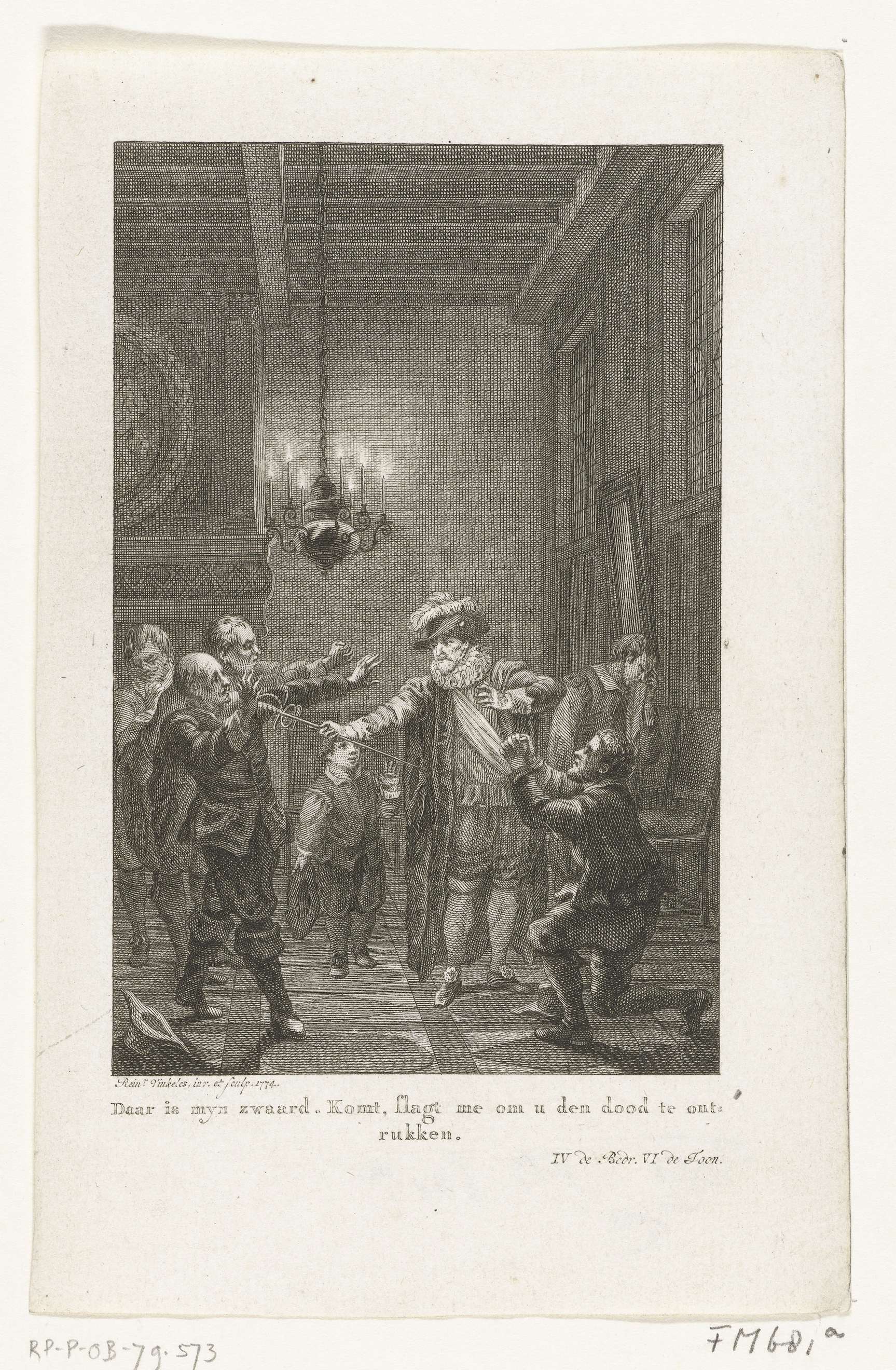 De zelfopoffering van burgemeester Pieter van der Werff, tijdens het beleg van Leiden, 1574. Interieur met Van der Werff die omstanders het zwaard aanreikt, bij kaarslicht (klein formaat).