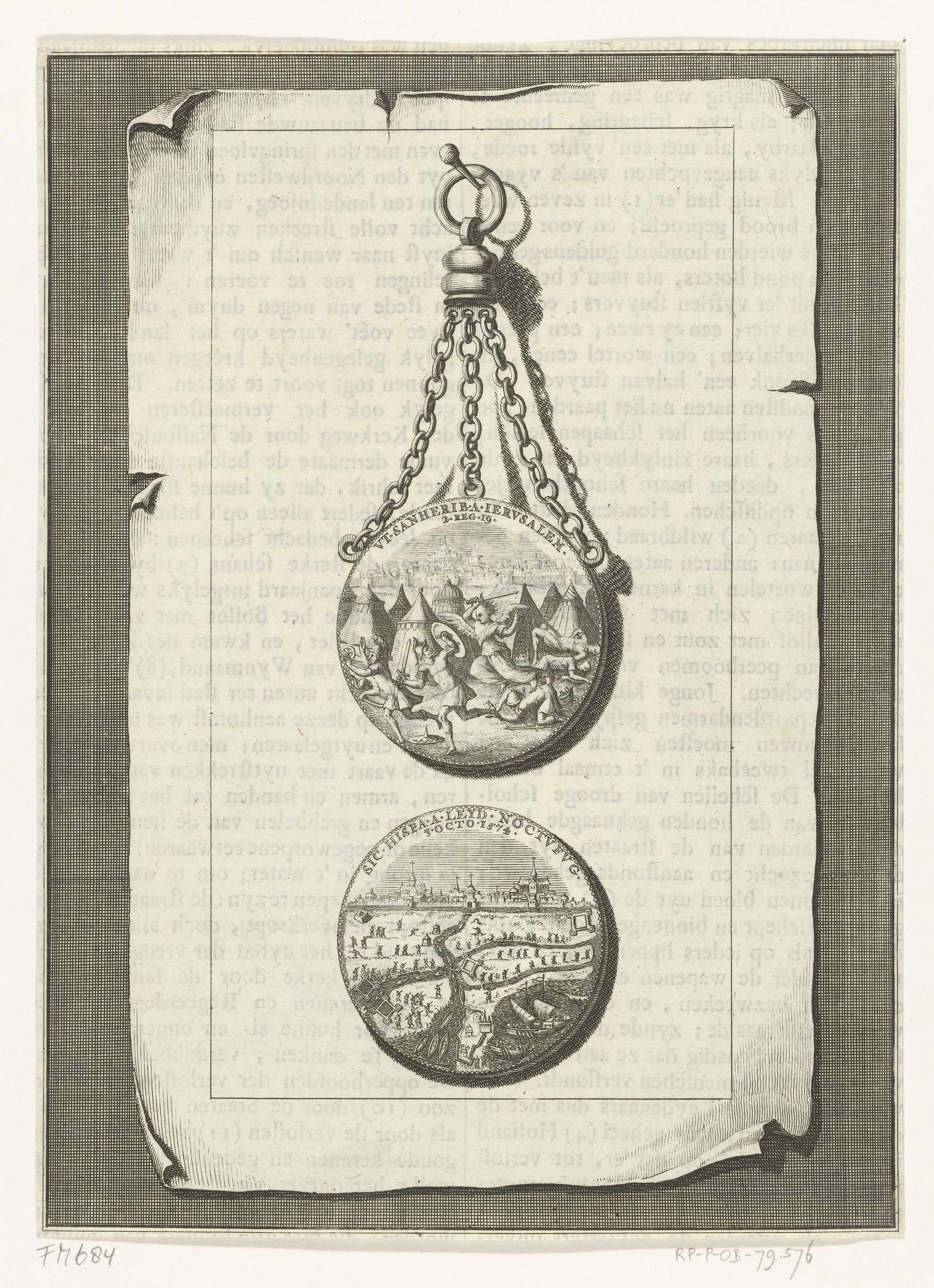 Penning op het ontzet van Leiden, 1574. Draagpenning aan een hanger, voor- en keerzijde in trompe-l'oeil tegen een opgeplakt vel papier. Bedrukt op achterzijde met tekst in het Nederlands. Zilveren penning aan drie kettingen en draagring. Voorzijde: beleg van Jeruzalem door de koning van Assyrië, wiens soldaten uit tentenkamp vluchten voor een engel met getrokken ...