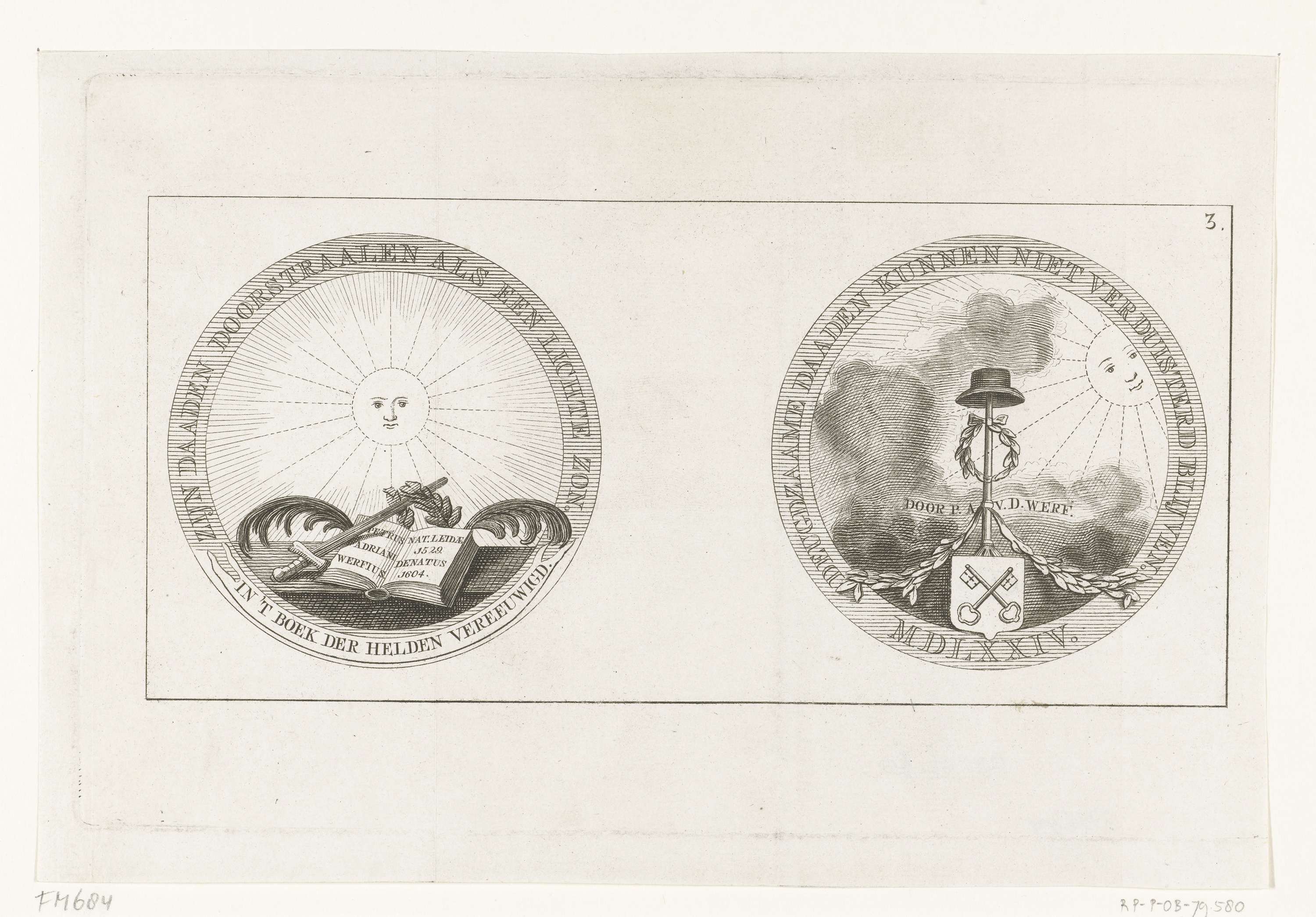 Penning bij het overlijden van Pieter Adriaansz. van der Werff, 1604. Voorzijde stralende zon boven opengeslagen boek met geboorte- en sterfjaar van Van der Werff. Keerzijde: lans met vrijheidshoed, wapen van Leiden en stralende zon. Rechtsboven genummerd: 3.